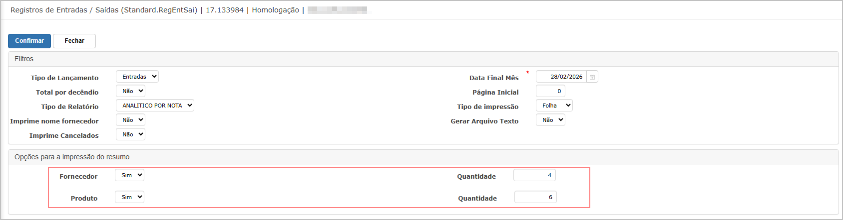 Para esse exemplo a opção imprimir nome do fornecedor não interfere, mas a apção de resumo por fornecedor deve ser marcada Sim e o campo quantidade é obrigatório.