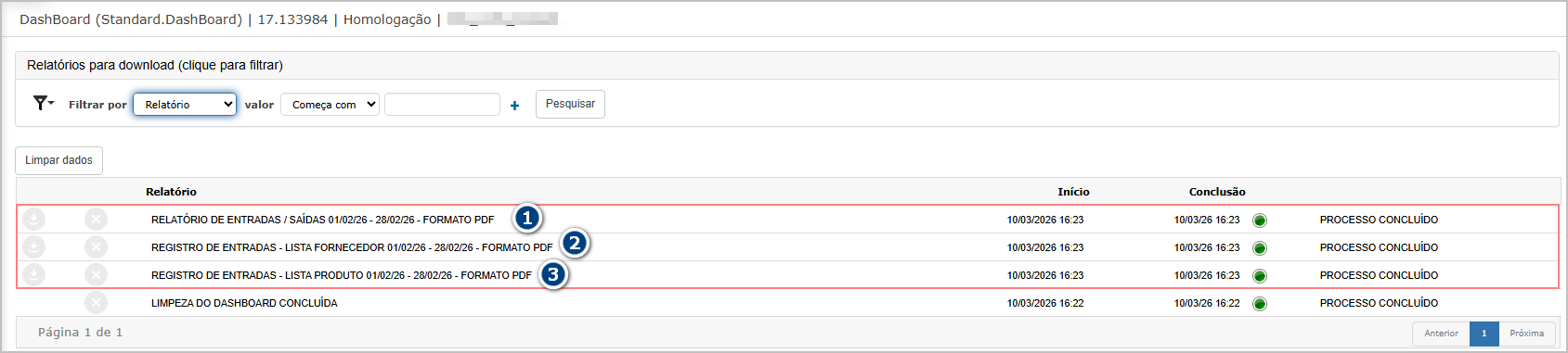 Após confirmar a geração do relatório, o sistema direcionará para dashbord, onde é possivel baixar o relatório. O resumo por fornecedor é gerado em um arquivo PDF separado no dashboard.