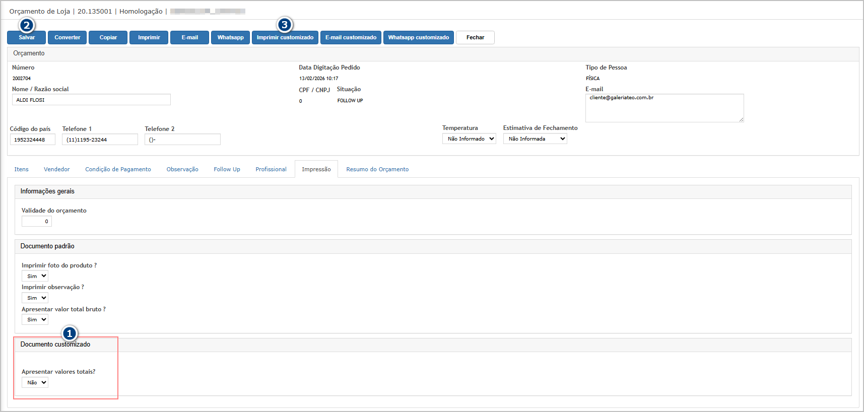 Após abrir o orçamento, vá na aba Impressão e selecione na opção Apresentar valores totais: SIM (1) e salve o orçamento (2).