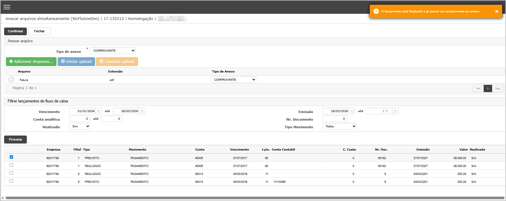 “Não permite selecionar mais de um anexo tipo comprovante quando o lançamento esteja realizado.”