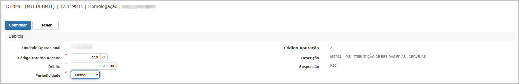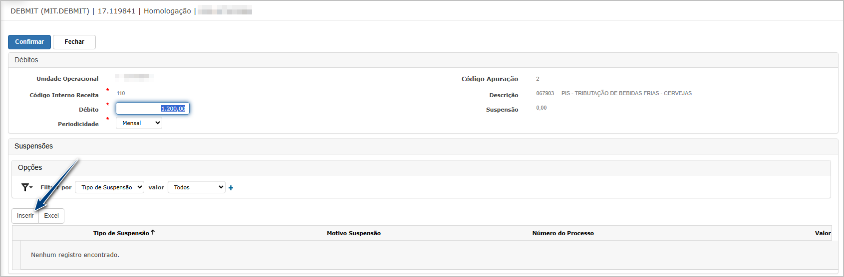 Após salvar (Confirmar), o bloco de débitos, será habilitada a inclusão de Suspensão.