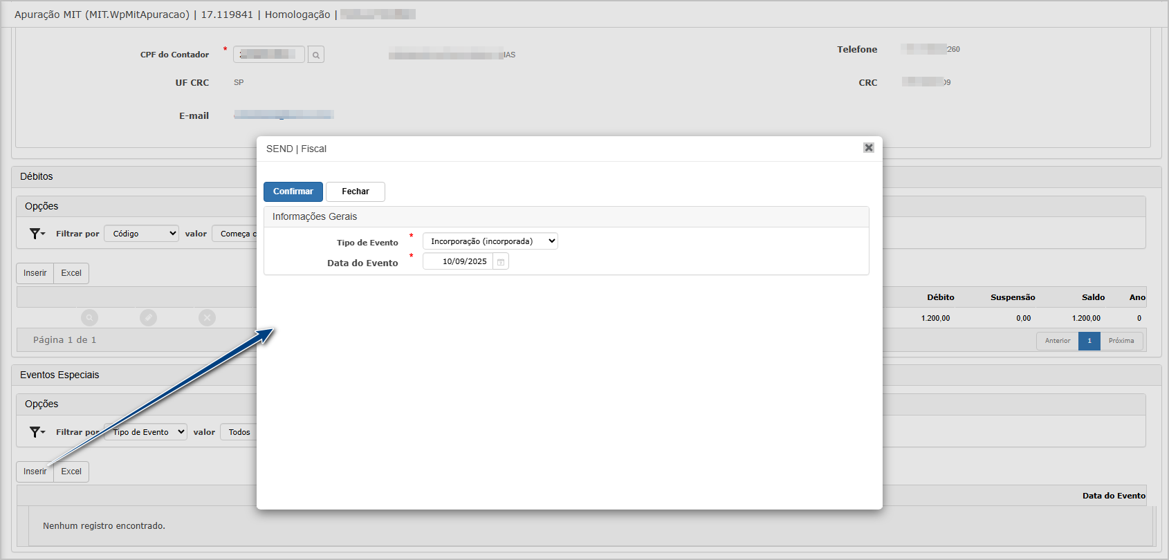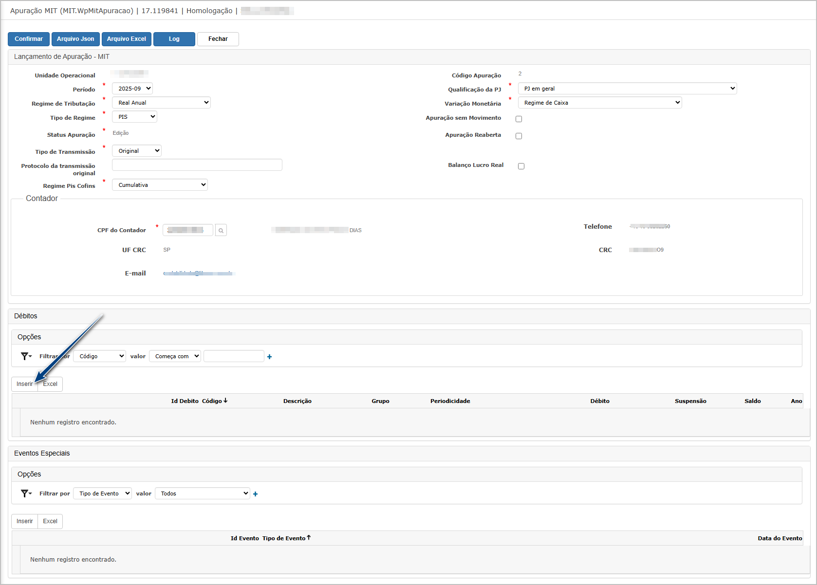 Para adicionar débito, basta clicar em inserir na tela de edição do período desejado.