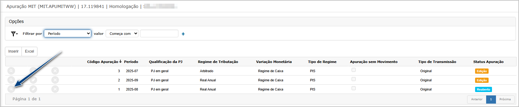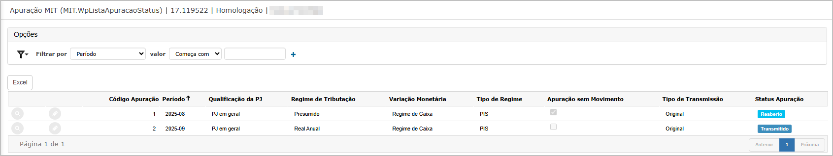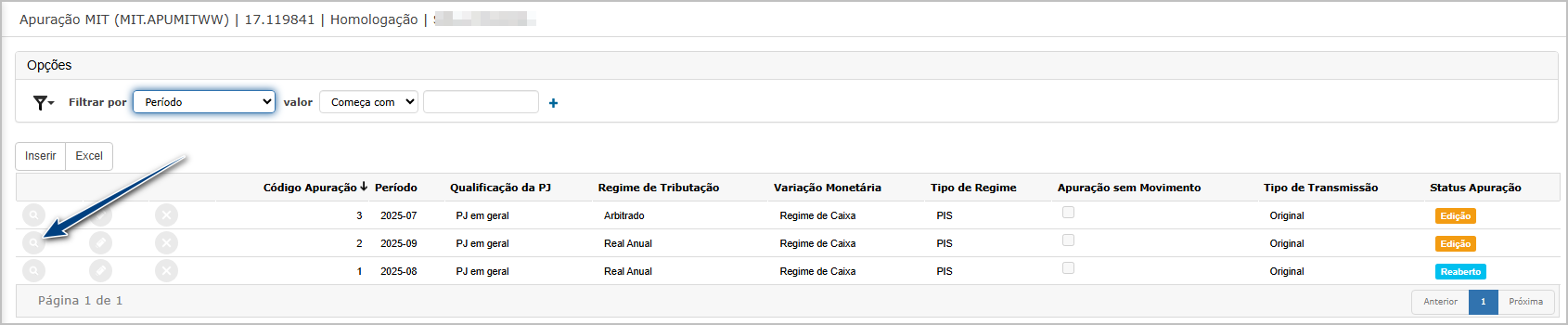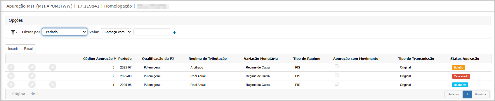 Ao entrar na tela serão exibidos os períodos com apuração criadas.