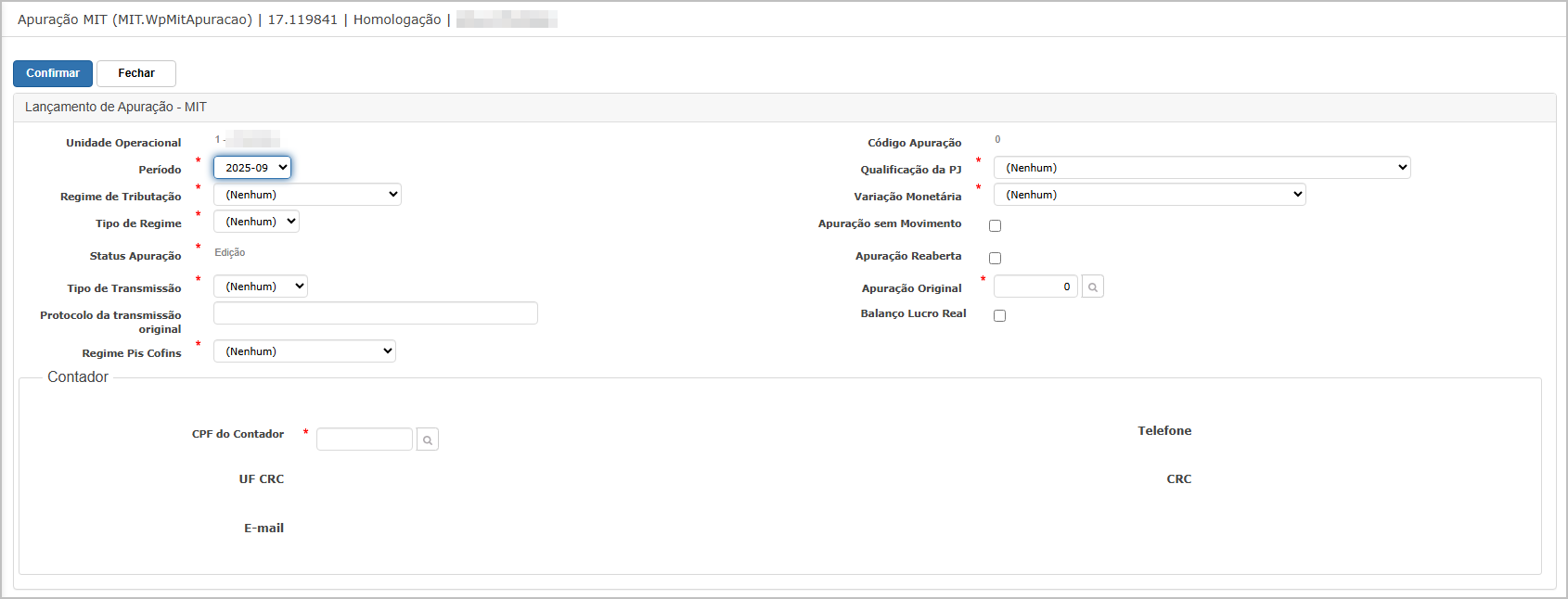 Insira as informações conforme necessidade e clique em Confirmar. Observação: Os campos marcados na configuração de lançamentos da Receita Federal, serão obrigatórios no vincula da apuração.