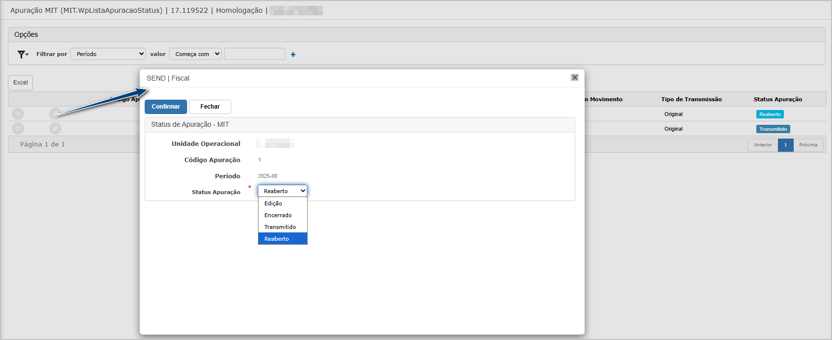 Clique em editar, o sistema exibirá um pop-up para alteração do status.