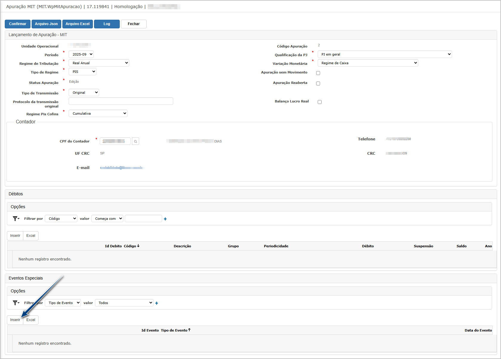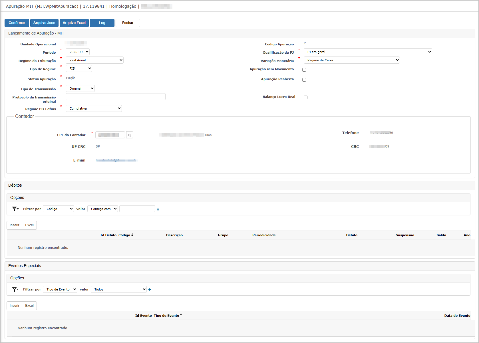 Na Edição da Apuração são habilitadas os blocos de Débitos e Eventos Especiais.