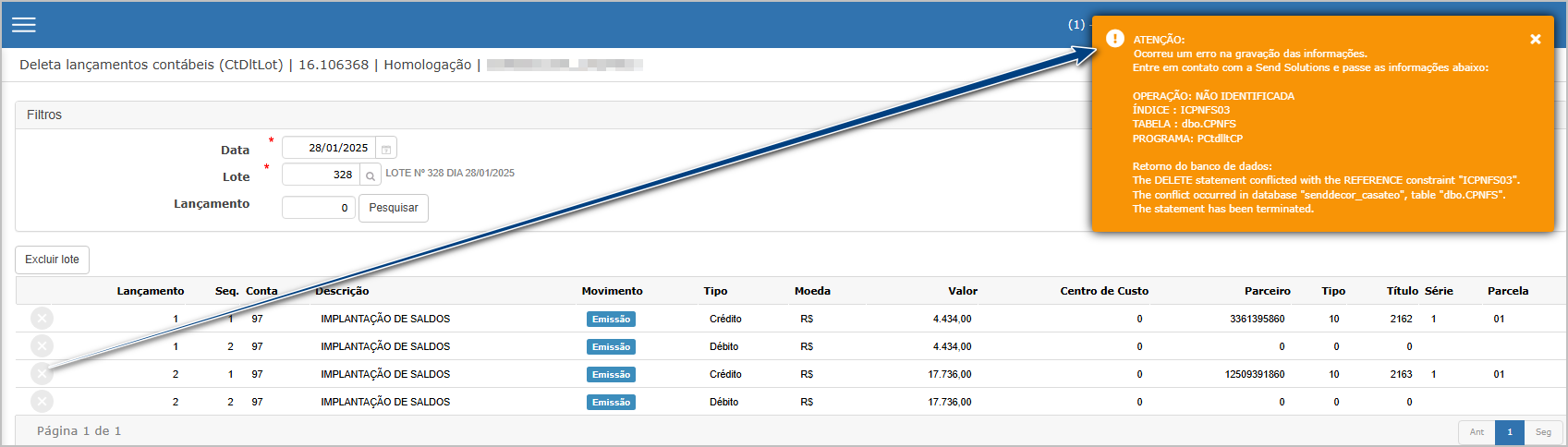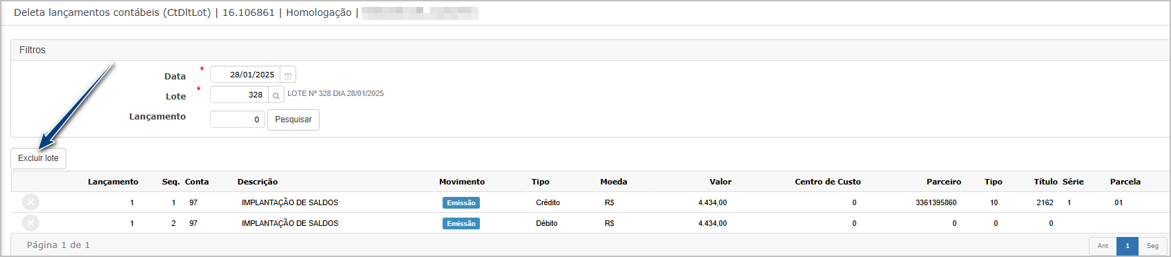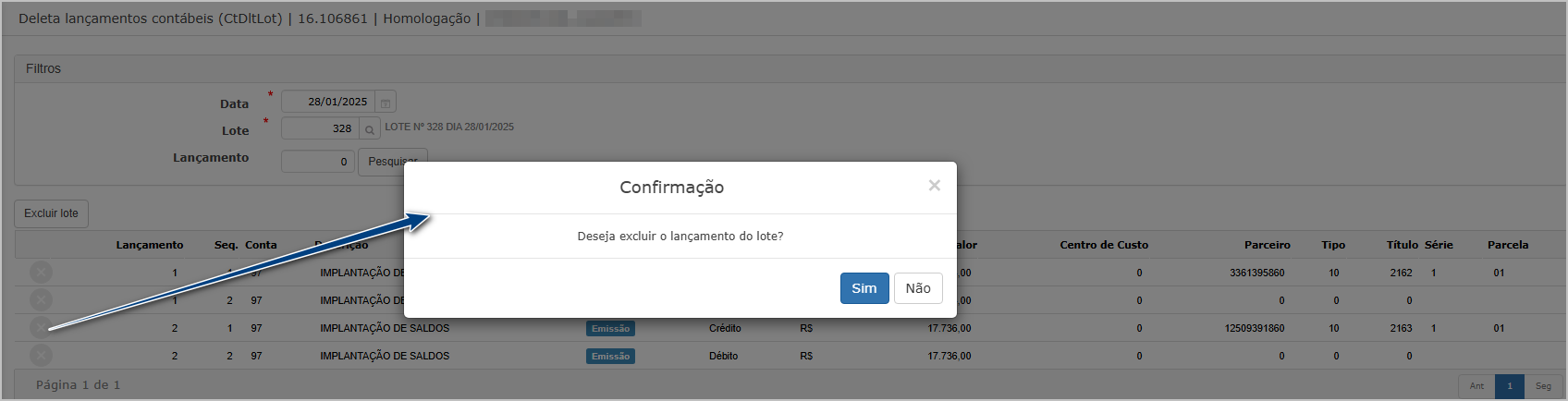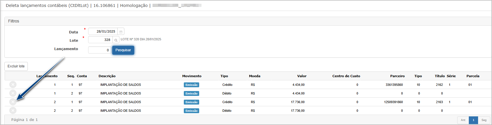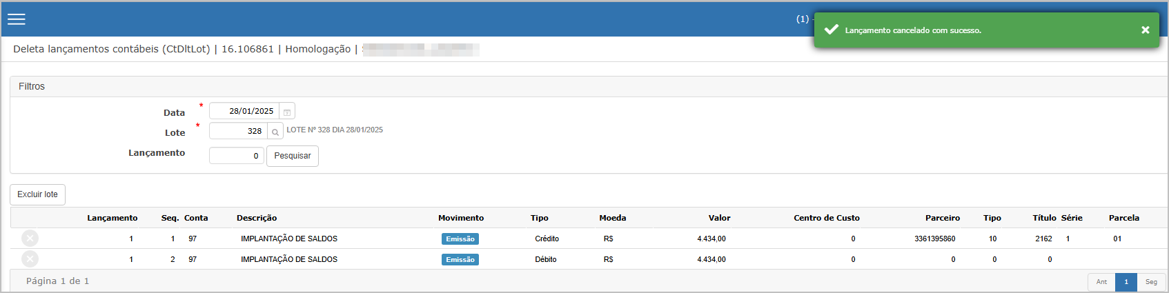 Na tela de cancelamento de lançamento, filtre a data e lote.