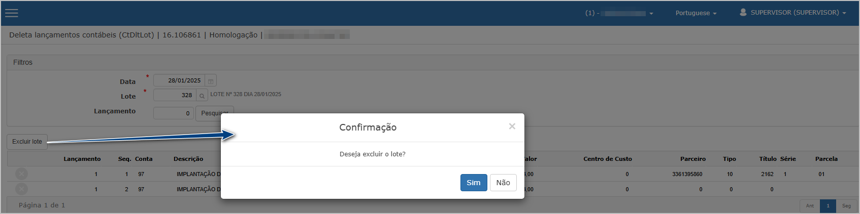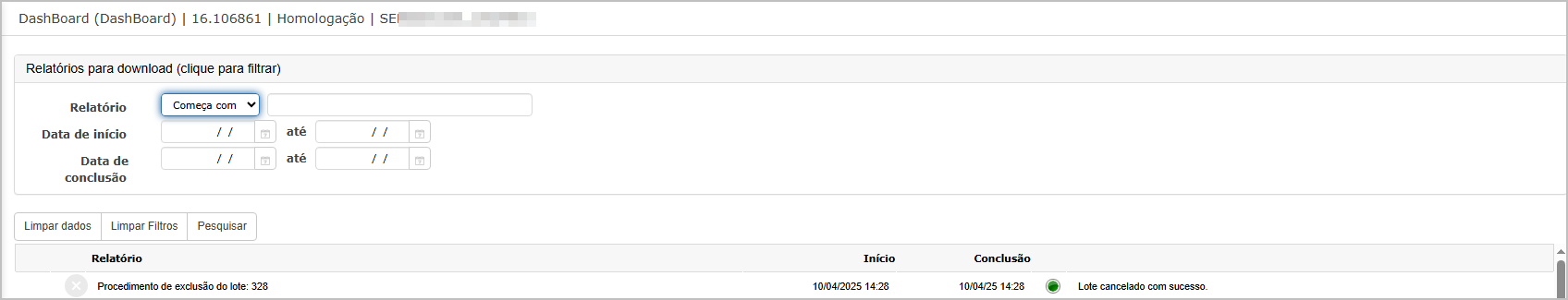 Na mesma tela, clique em “Excluir lote” após os filtros aplicados.