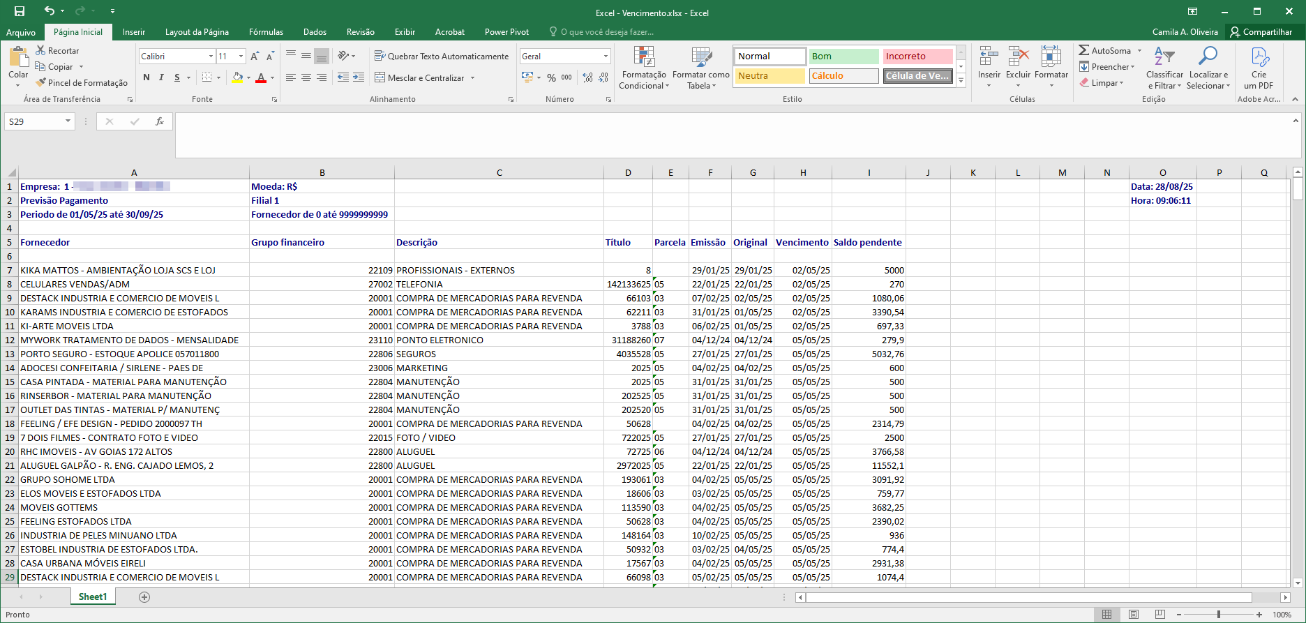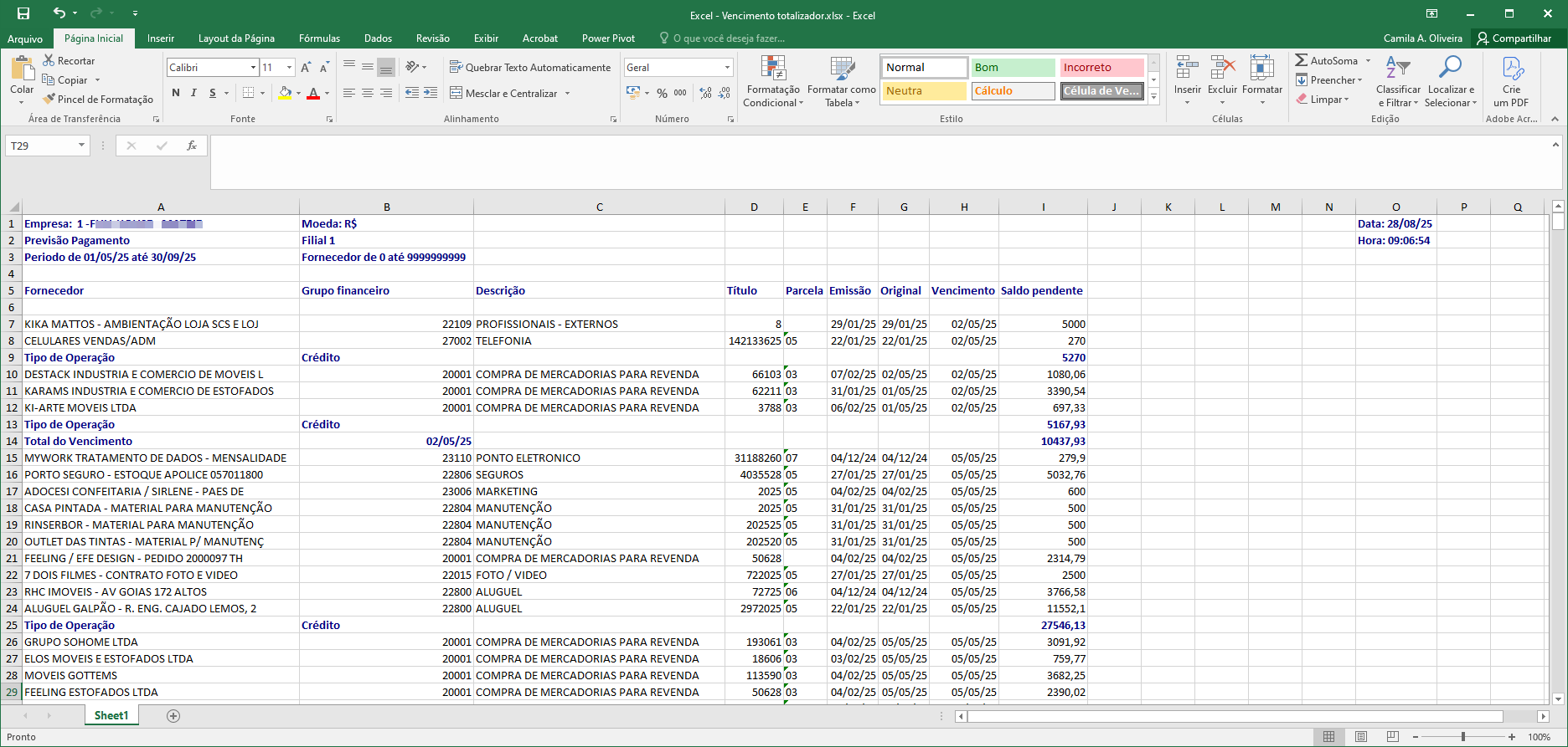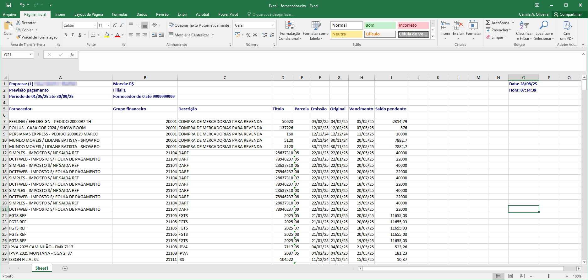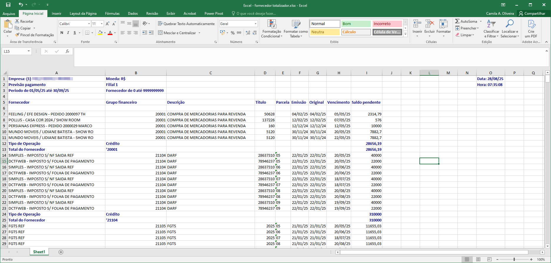 As colunas devem respeitar a sequência abaixo: - A: Fornecedor (quando for lançamento do financeiro será exibido o nome do fornecedor e quando for de origem fluxo de caixa será exibida a observação do lançamento);