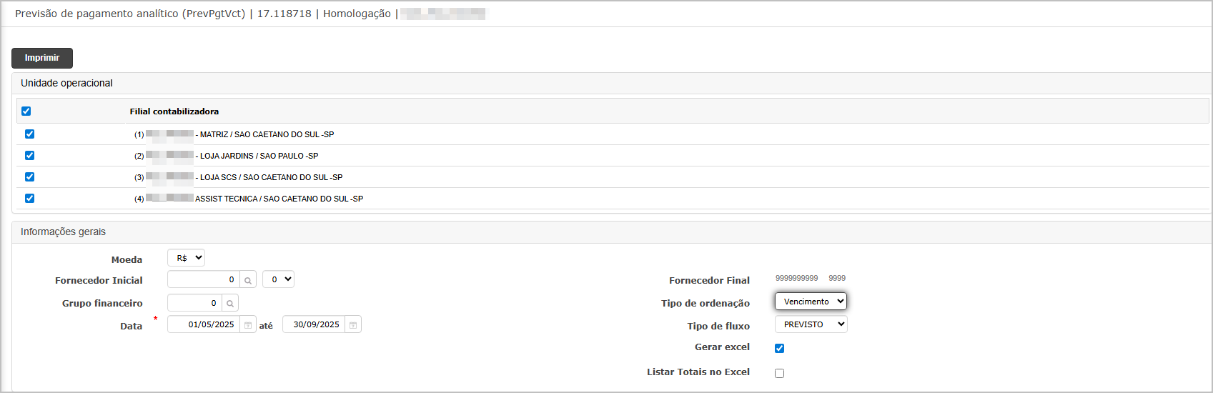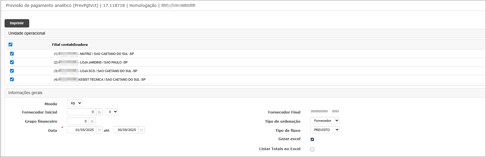 Cenário 1: Geração do relatório previsão de pagamento - Analítico - Previsto - Por Fornecedor