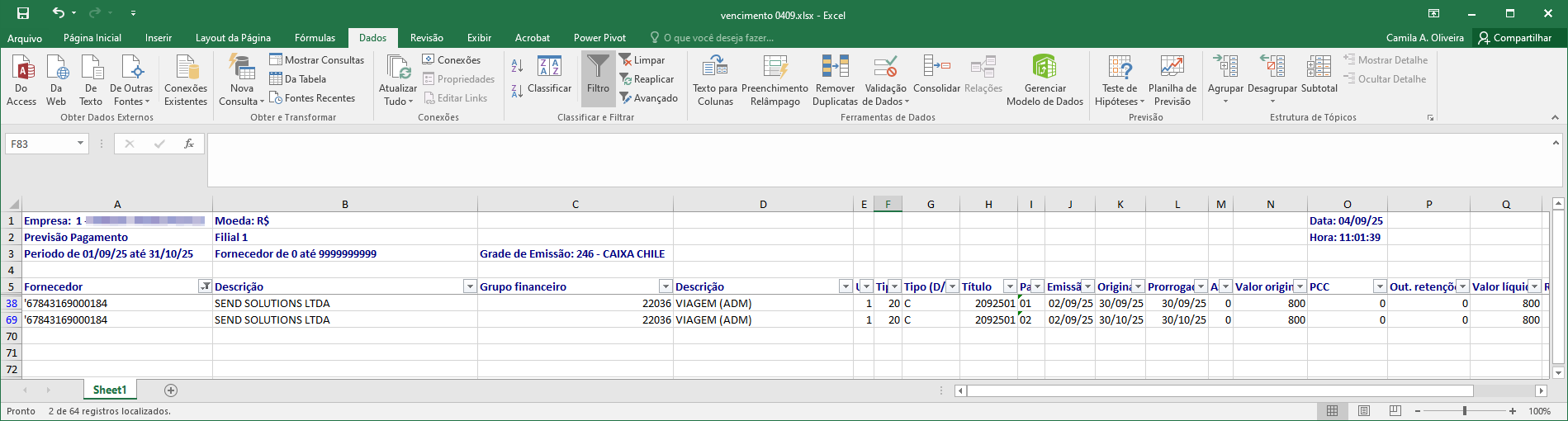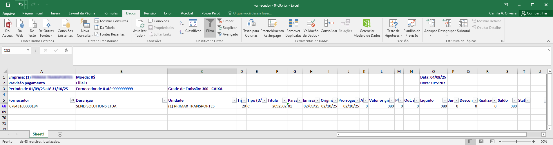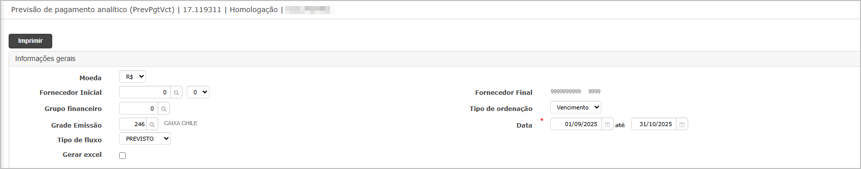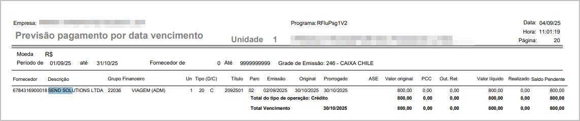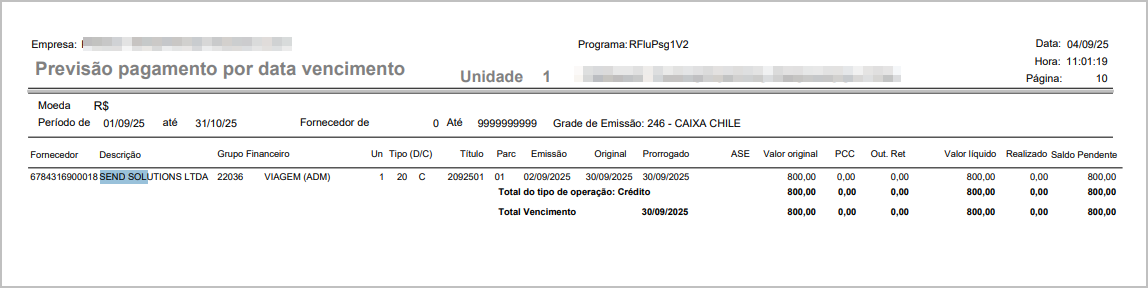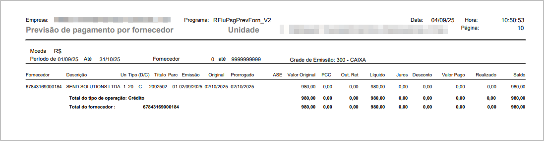 Cenário 3: Geração do relatório previsão de pagamento - Analítico - Previsto - Por Fornecedor
