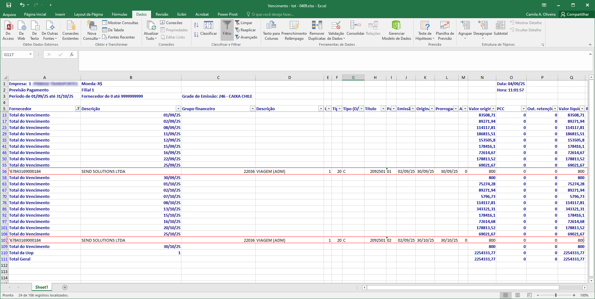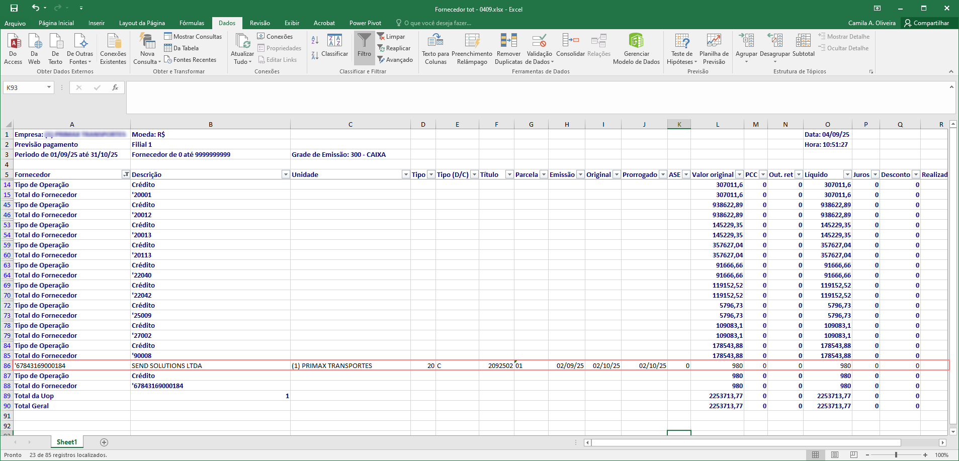 Relatório gerado em Excel com totalizador.