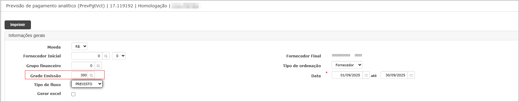 Inclusão do filtro "Grade de Emissão" no relatório Previsão (analítico), com manutenção dos formatos PDF e Excel, e das variações Por Fornecedor e Por Vencimento.