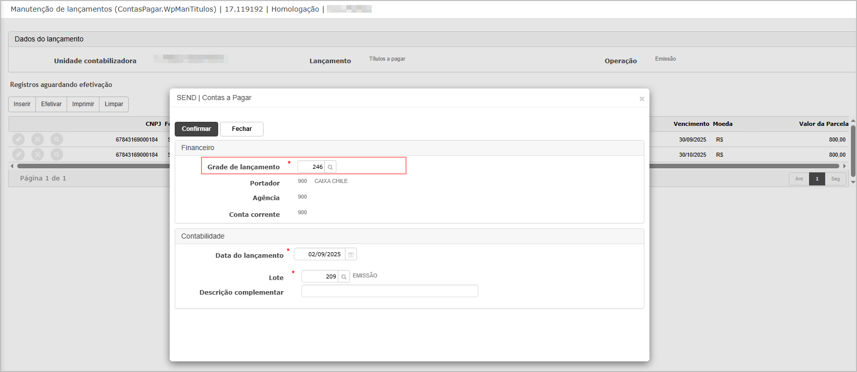 Ao efetivar o título, a grade é obrigatória; para novos títulos, o campo "Grade de Emissão" será sempre alimentado.