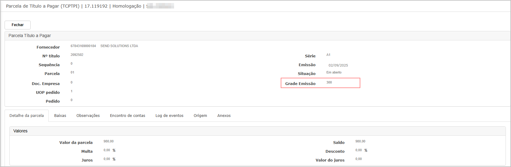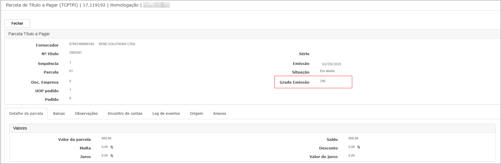 Após salvar, o título é criado com a Grade de Emissão.