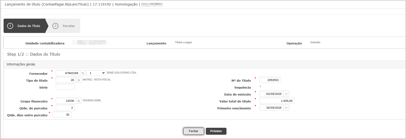 - Preencher fornecedor, data de emissão/competência, grupo financeiro e demais campos obrigatórios.