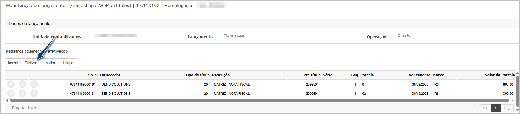 Ao retornar para tela principal, clique em Efetivar.