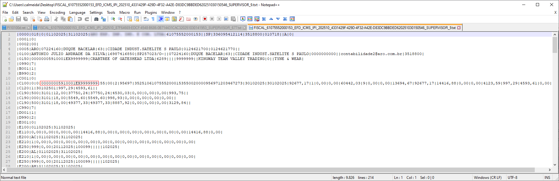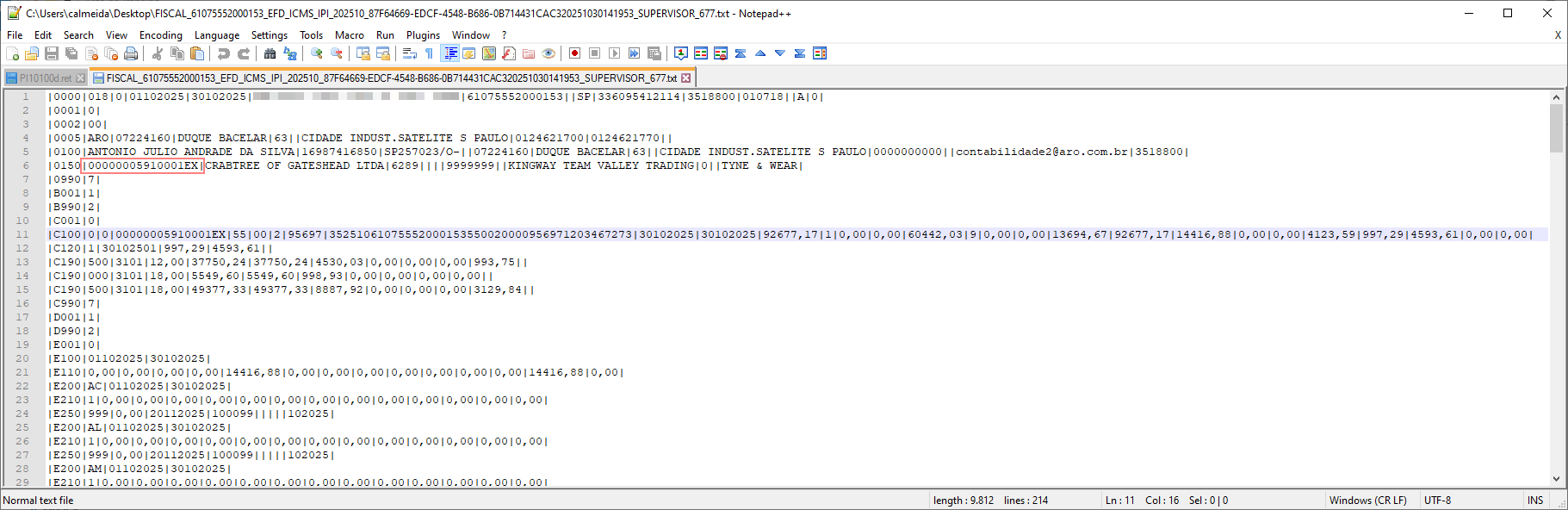 Os Registro C100, C195, C500, D100, D500, E300, E310 e E315 deve ter a informação (neste exemplo vamos validar o C100): - Pessoa jurídica: CNPJ + UF