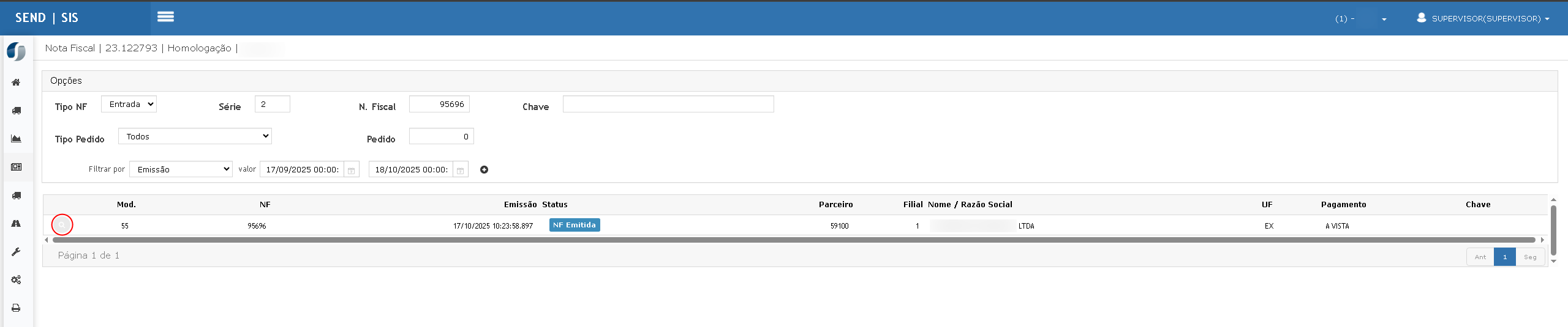 → Localizar NF (Tipo Entrada, Série 2, Número de exemplo 95696).