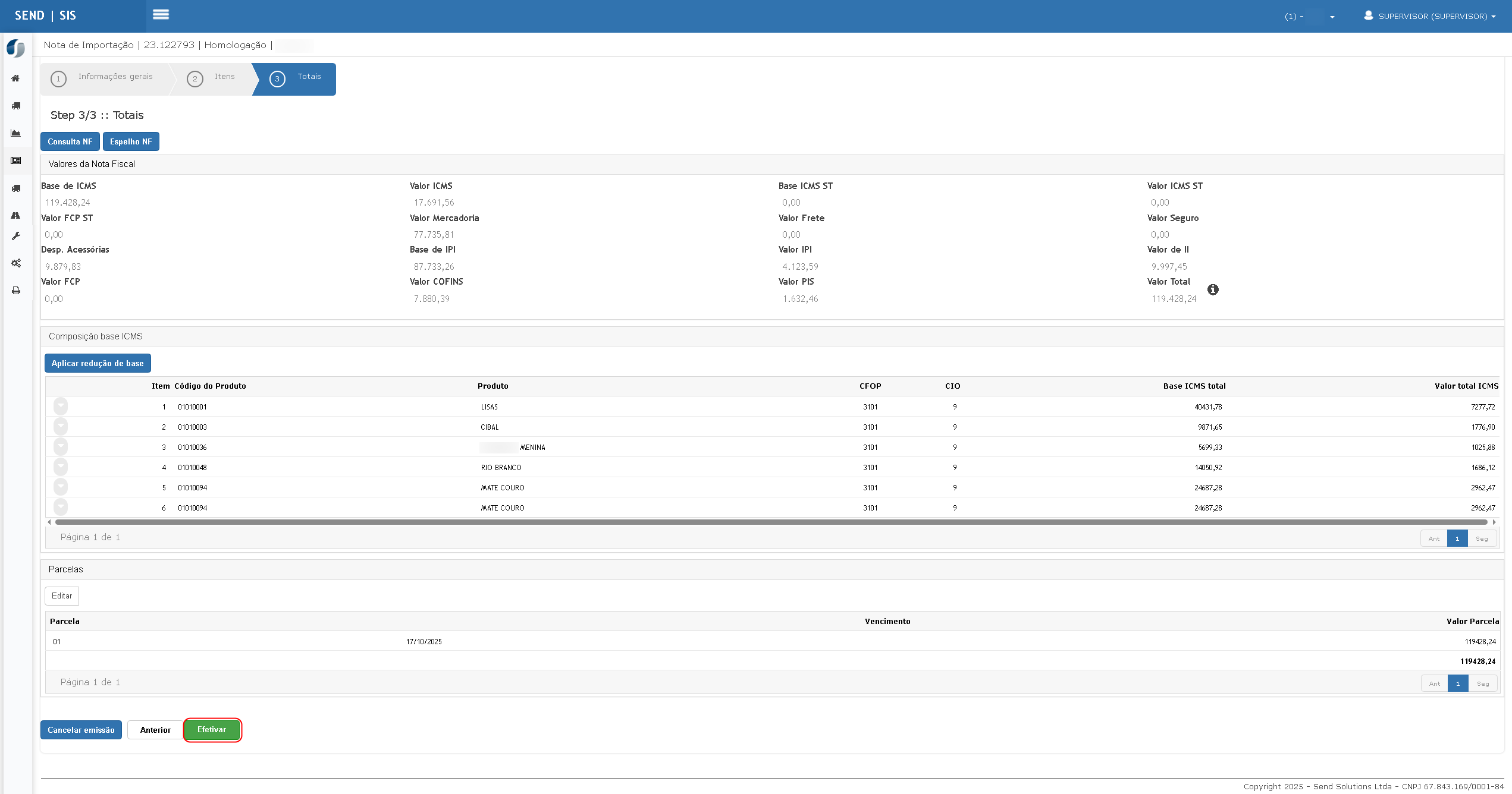 Validar que, com todos os itens corretos, a NF é efetivada normalmente.