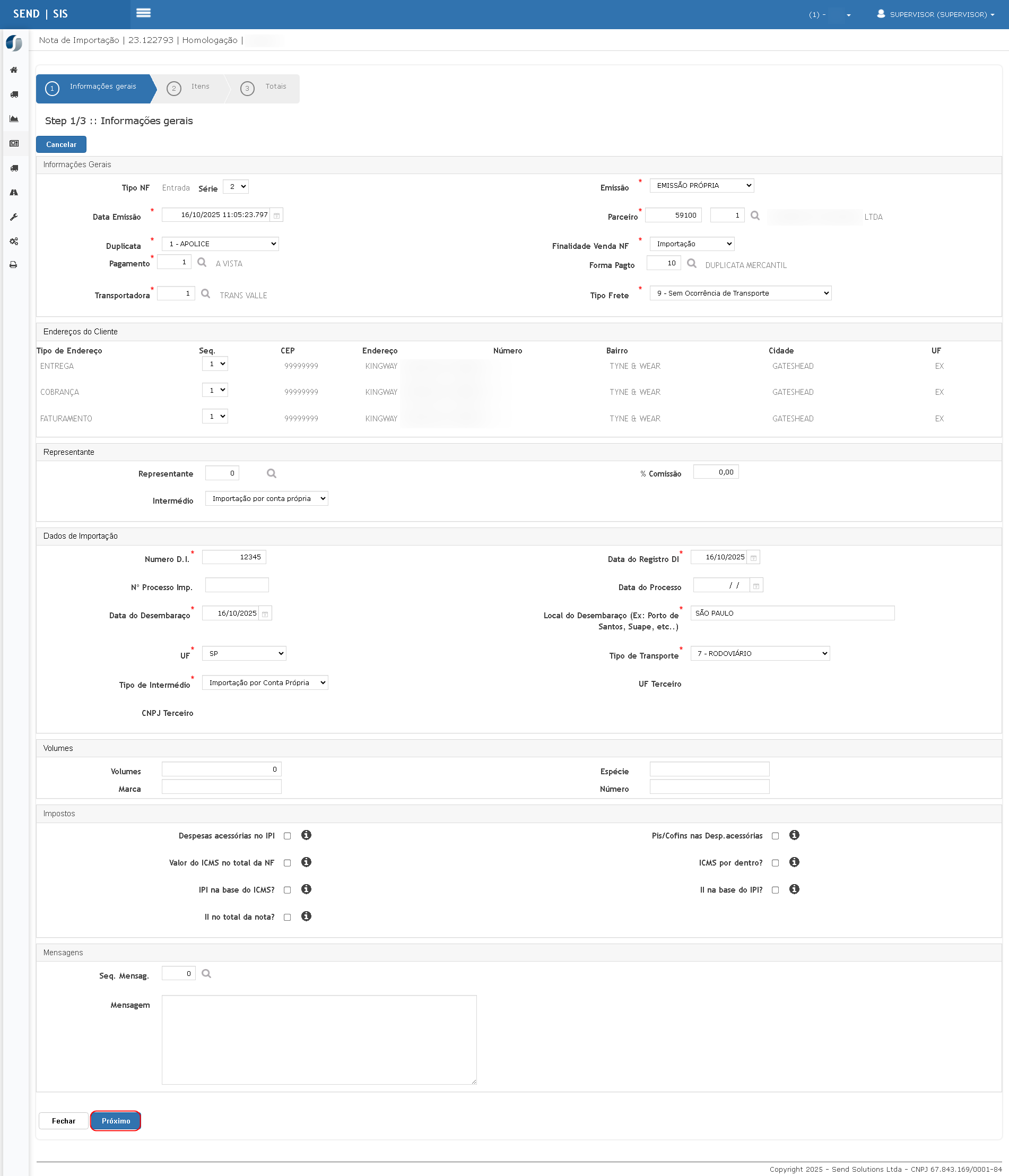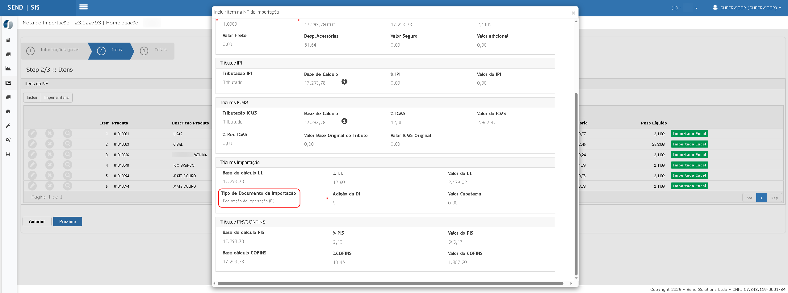 → Bloco “Dados de Importação” aparece (DI, Processo, Adição, Tipo Transporte etc.).