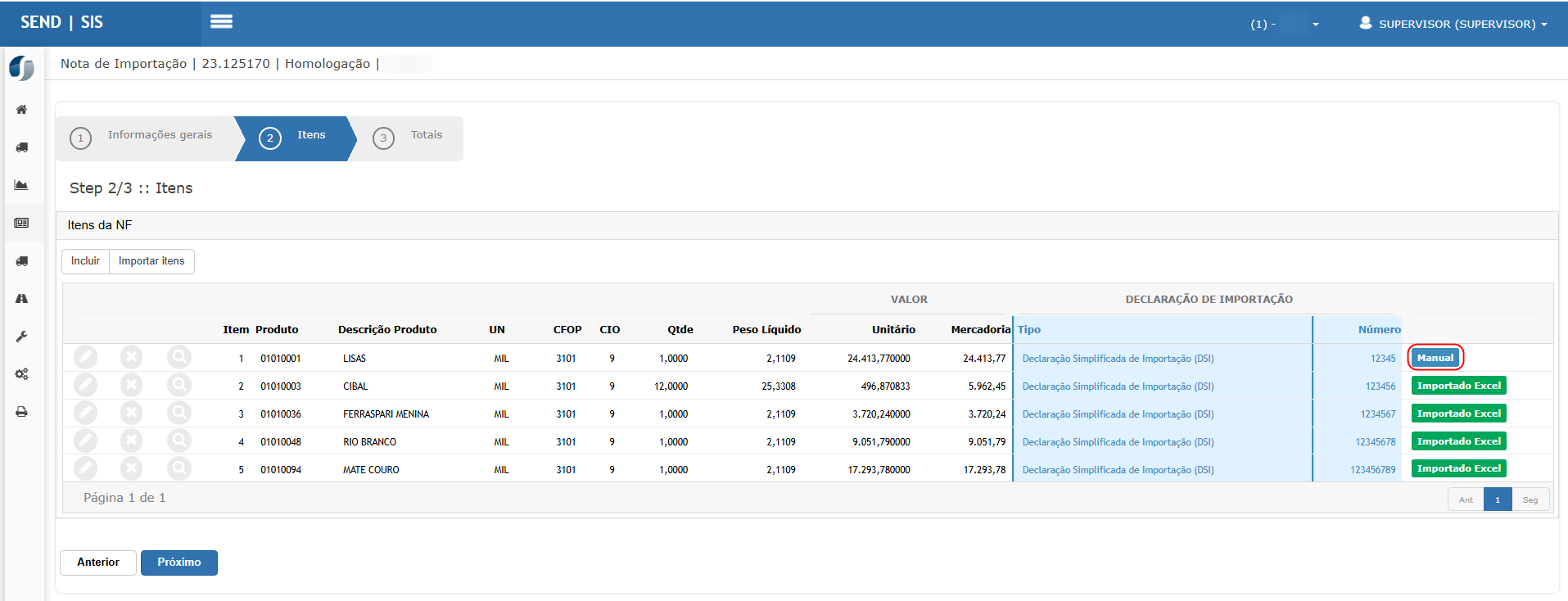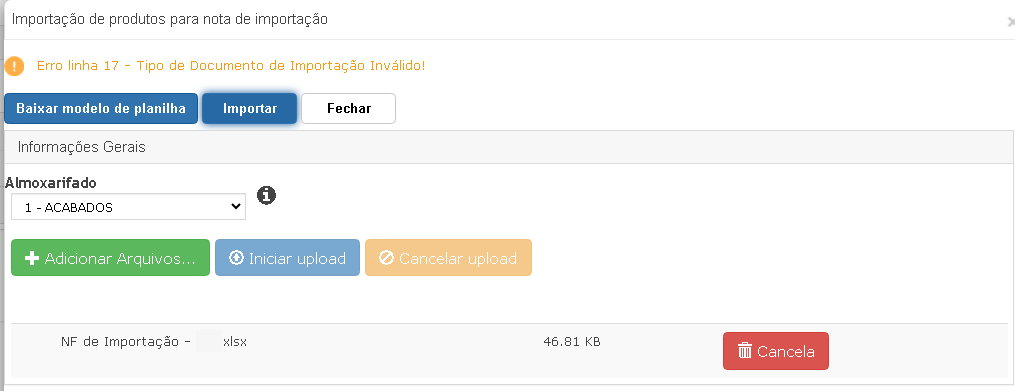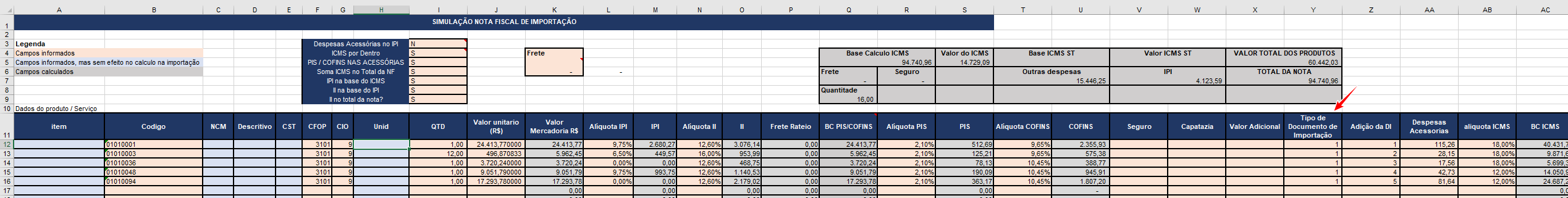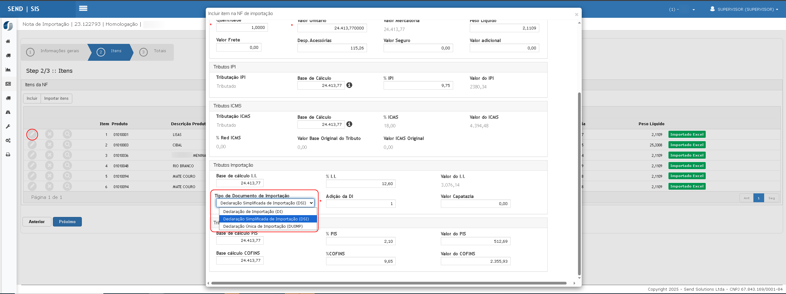 Validar o upload da planilha contendo a coluna Tipo de Documento de Importação e o carregamento dos itens.
