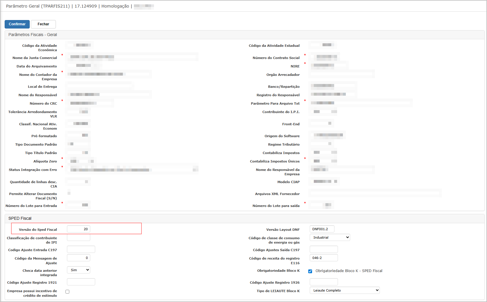 Ao abrir a tela de edição do parâmetro, encontre o bloco SPED Fiscal e altere o valor do campo Versão SPED Fiscal para 20.