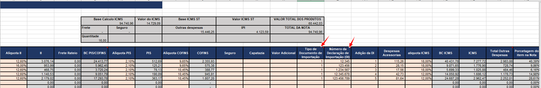 → Em Tributos Importação, o Tipo de Documento de Importação aparece com descrição (ex.: Declaração de Importação (DI)). Caso não seja informado nenhuma opção na planilha será reconhecido como (DI). -