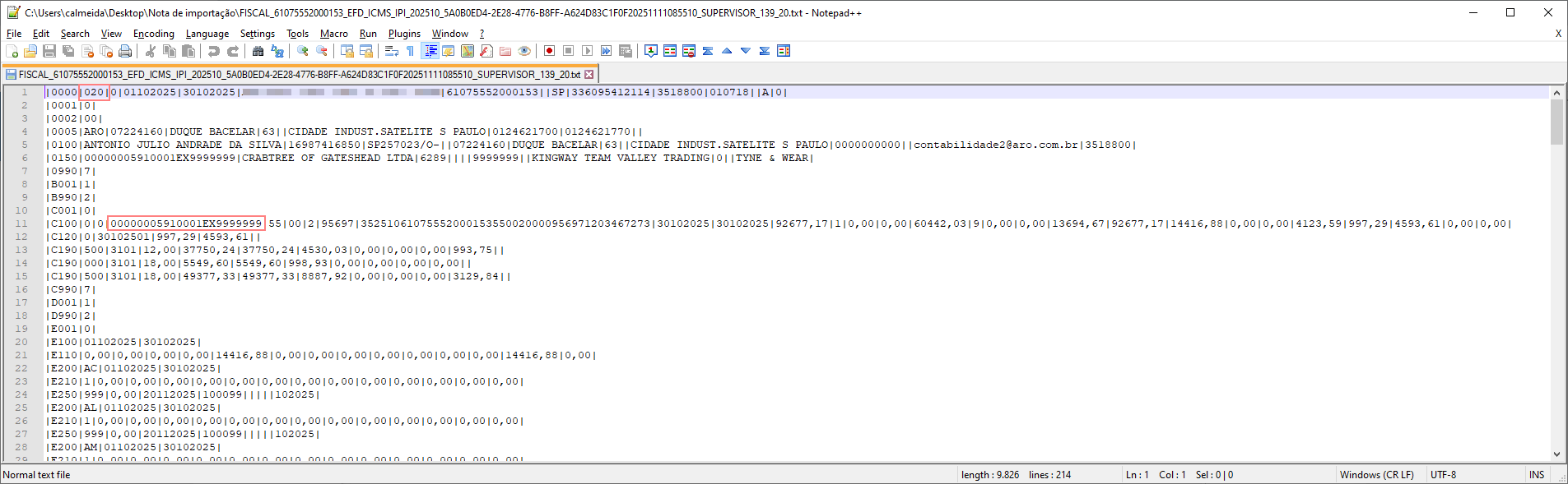 Os Registro C100, C195, C500, D100, D500, E300, E310 e E315 deve ter a informação (neste exemplo vamos validar o C100):