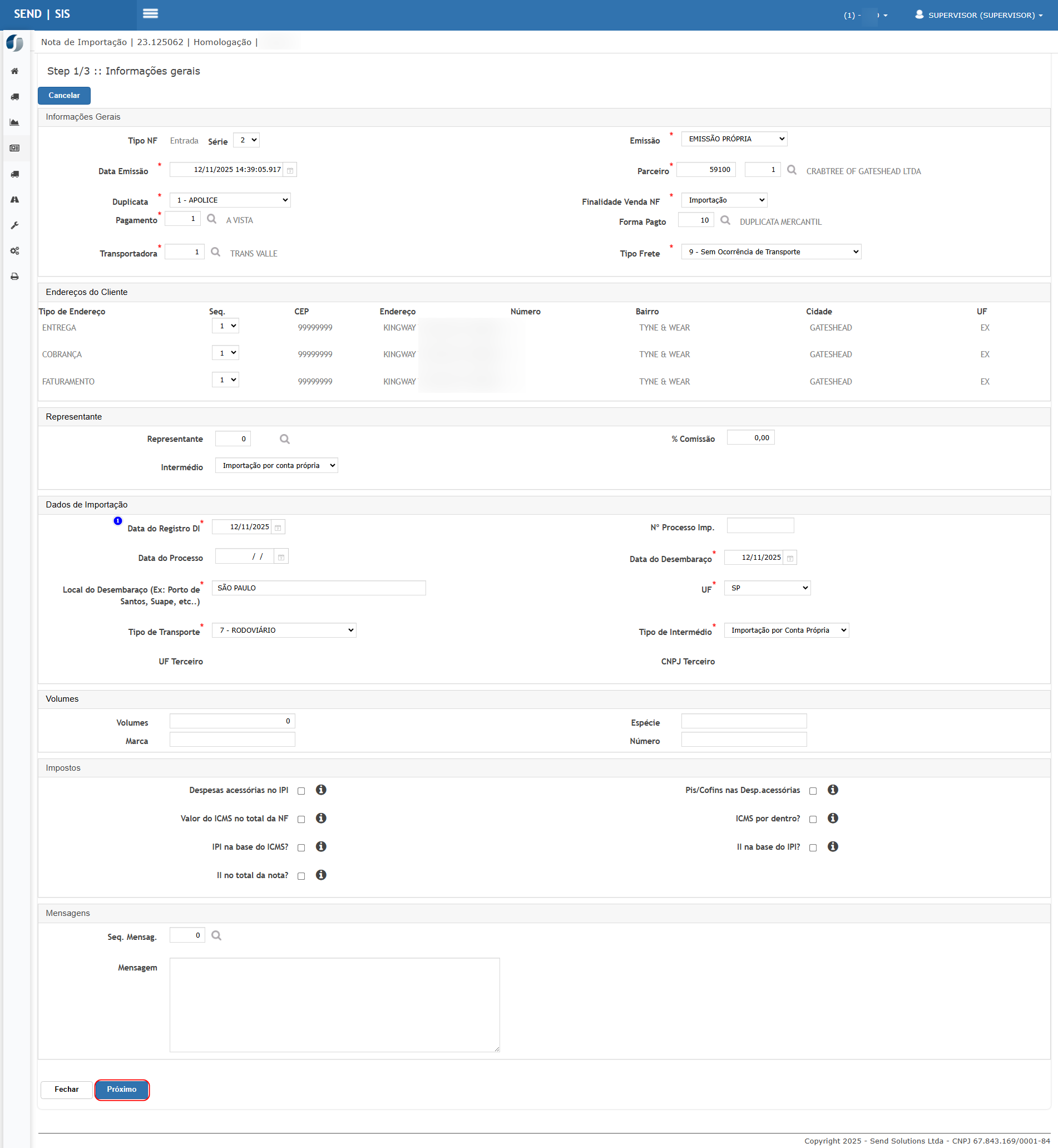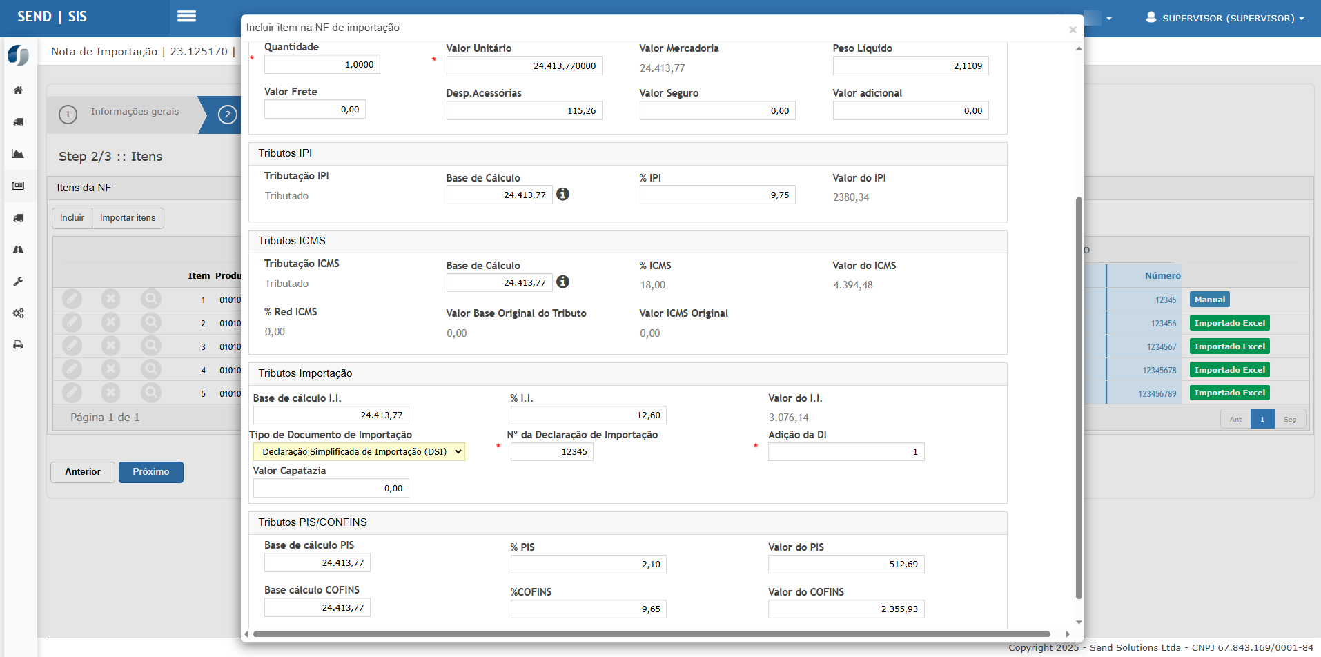 → Bloco “Dados de Importação” aparece (DI, Processo, Adição, Tipo Transporte etc.). -