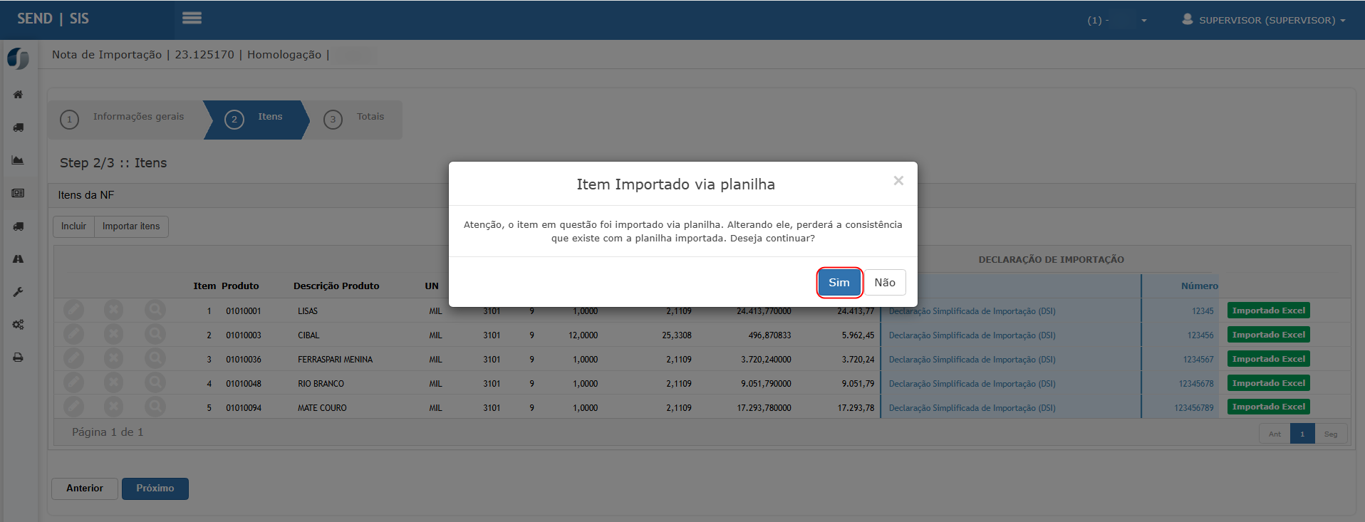 CENÁRIO 01 – Exibição e seleção da Finalidade “Importação”