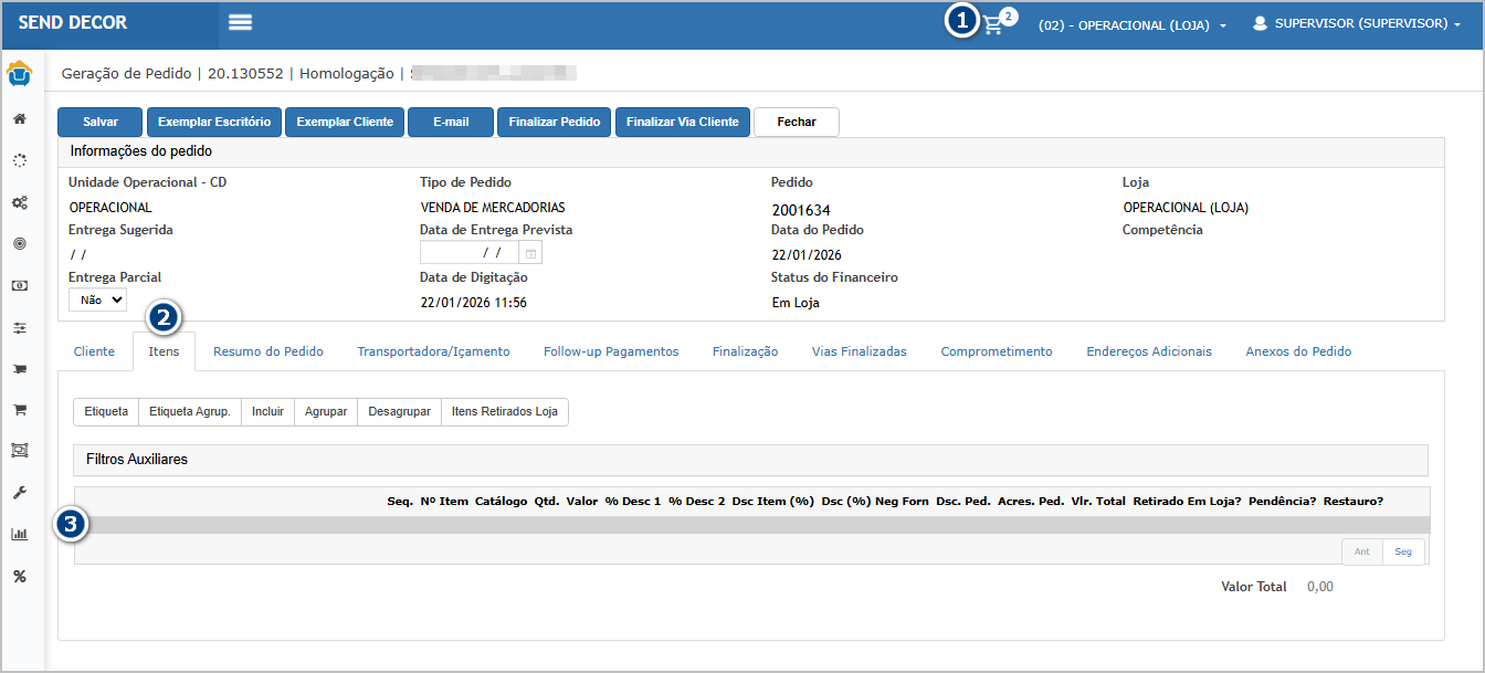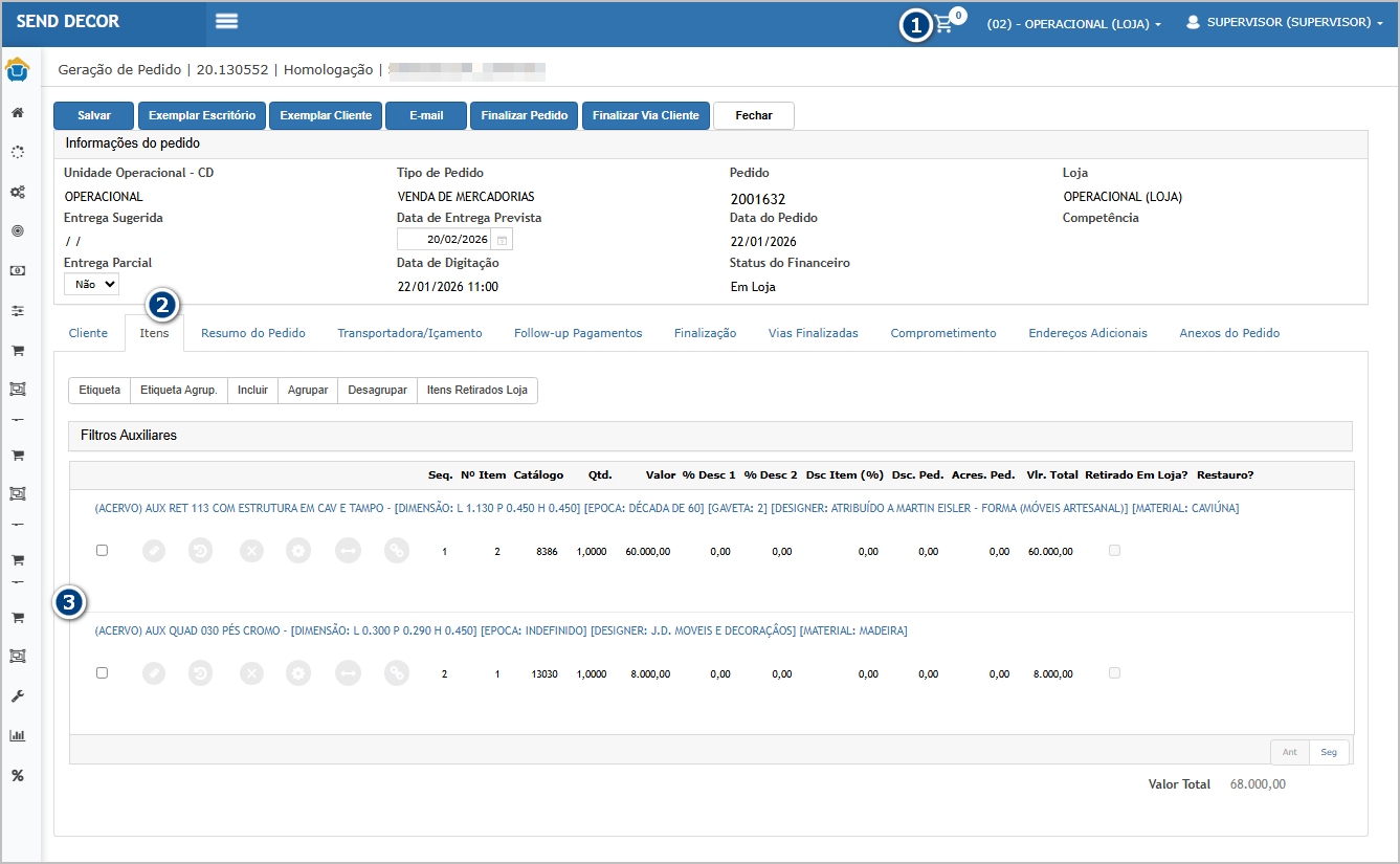 Na aba itens (2), os itens (3) que estavam no carrinho foram adicionados no pedido.