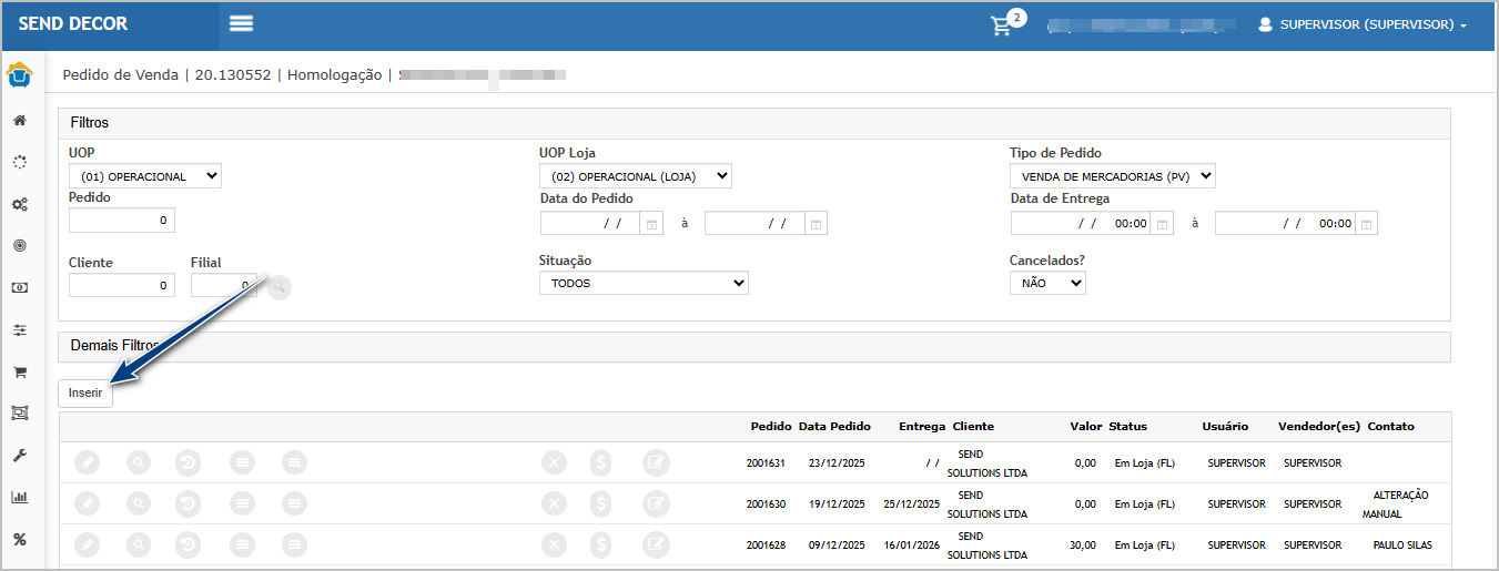 - Acessar Pedido > Pedido de venda (Inserir um pedido).