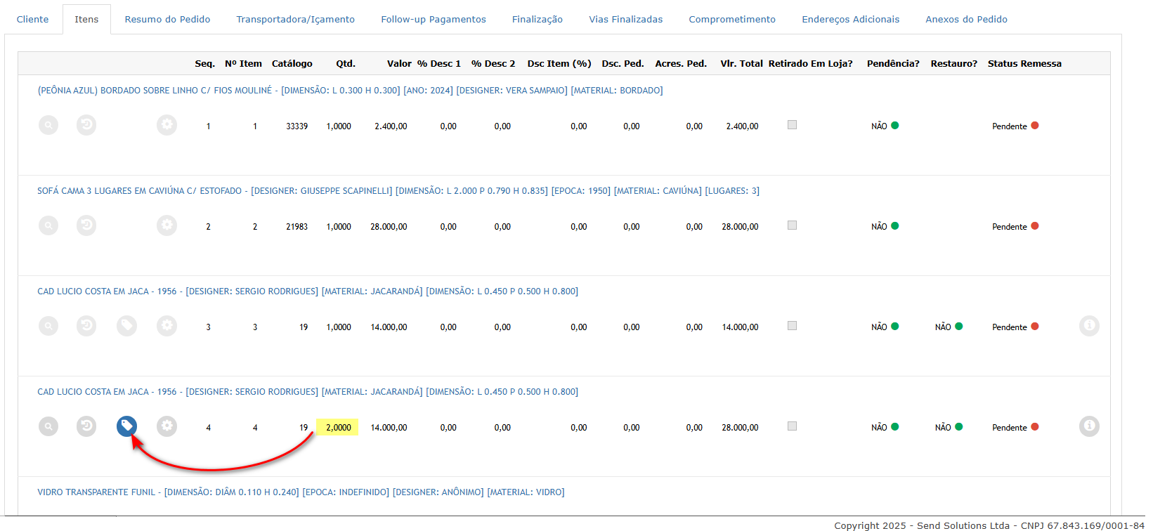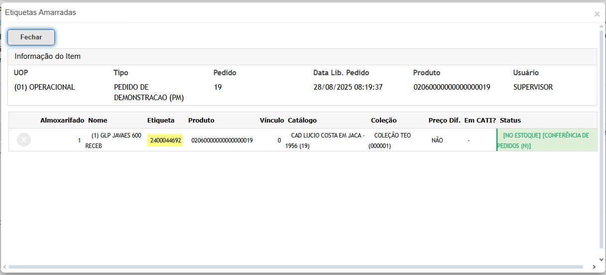 Note que ao consultar o item 4, existe 2 quantidades e apenas uma etiqueta vinculada;
