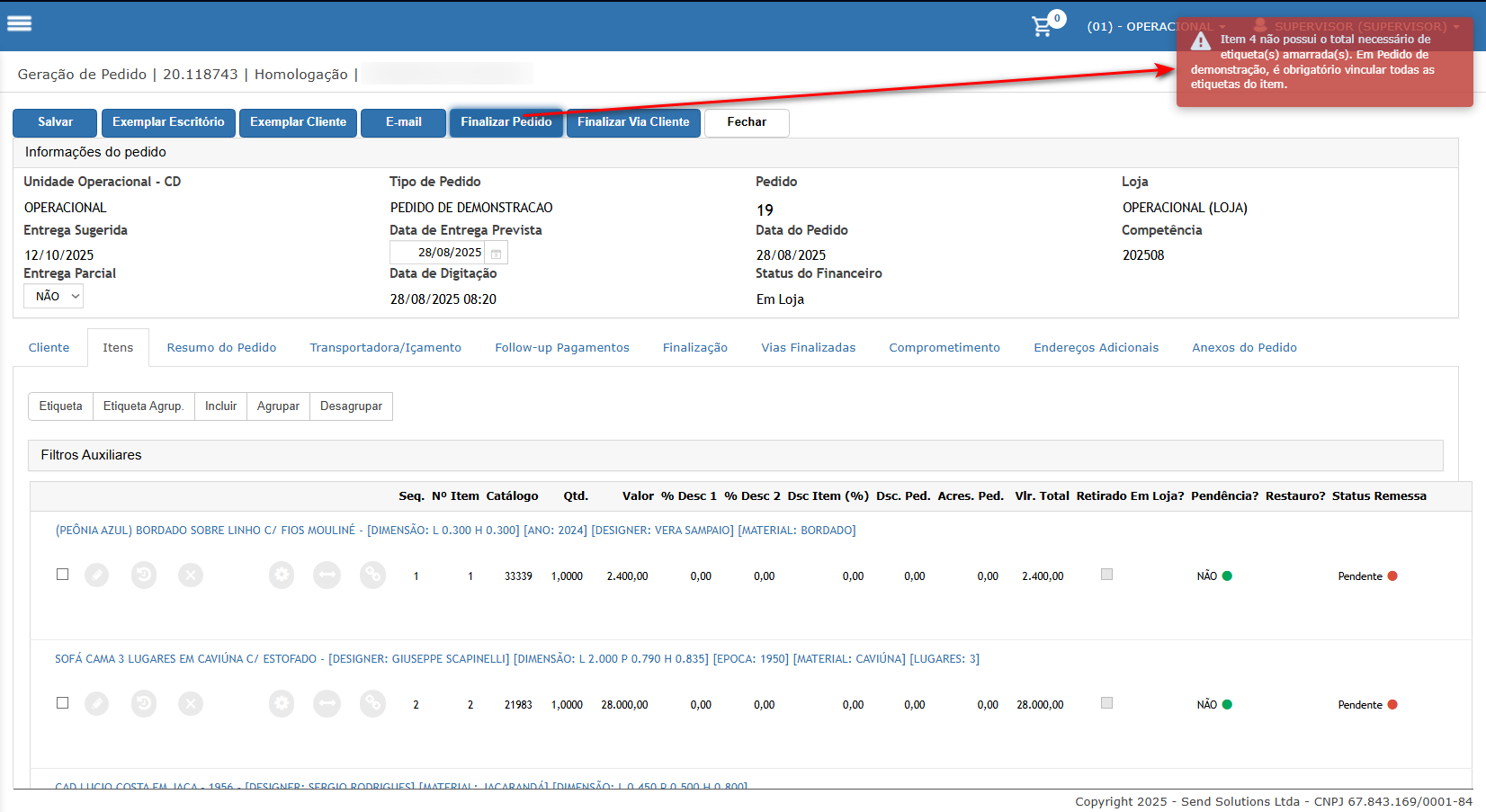 - Note que após selecionar o tipo de pedido como Demonstração, será exibido as divergências de etiqueta, porem com a funcionalidade marcada para o perfil, após apertar em confirmar irá direcionar para o pedido;