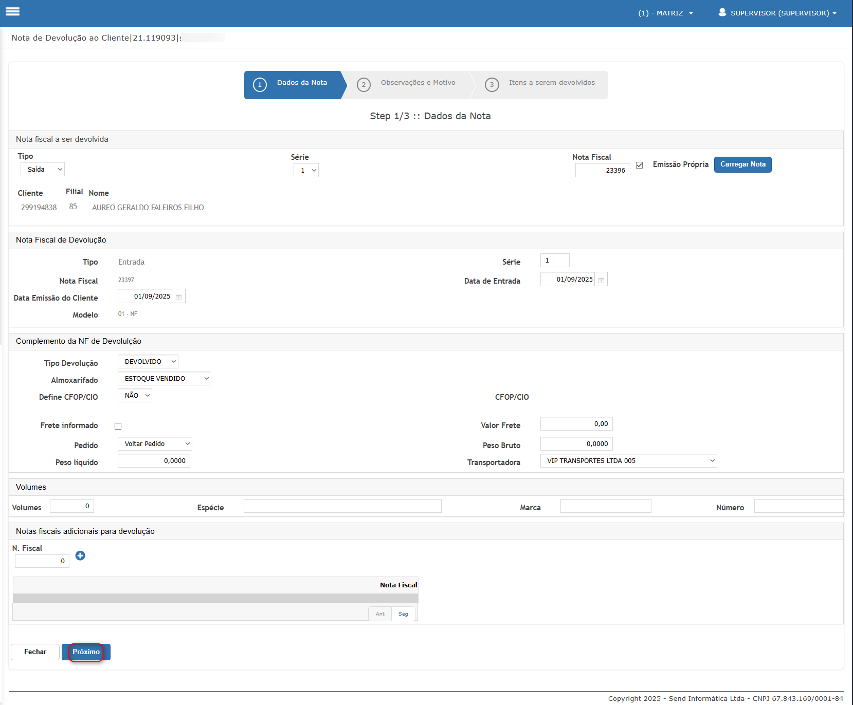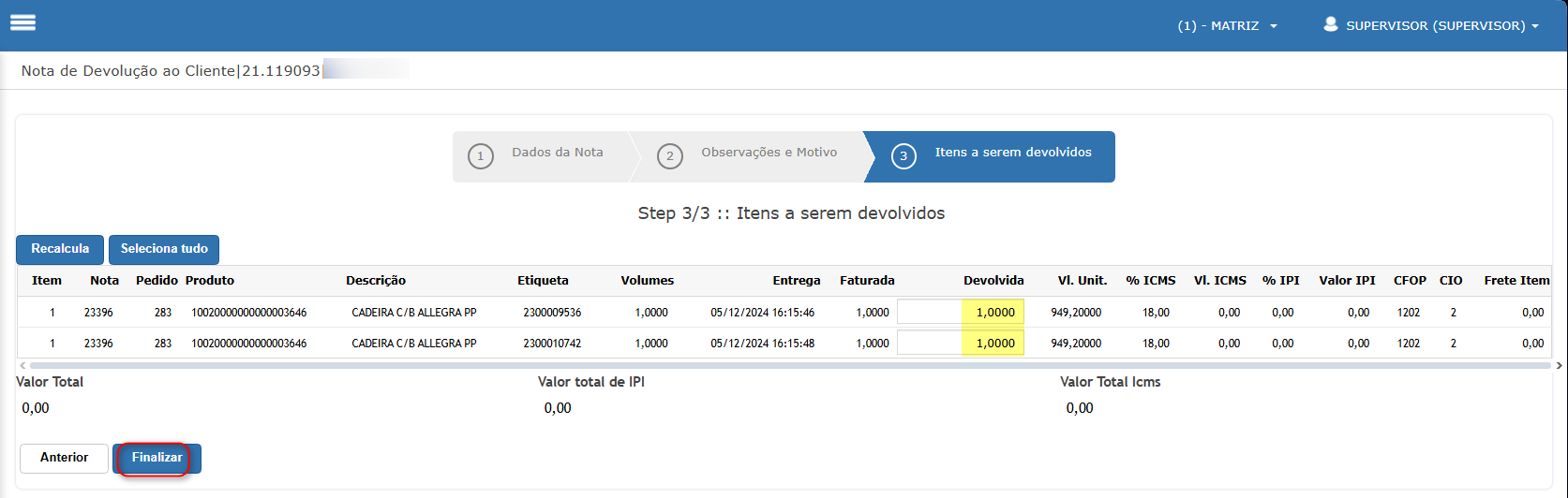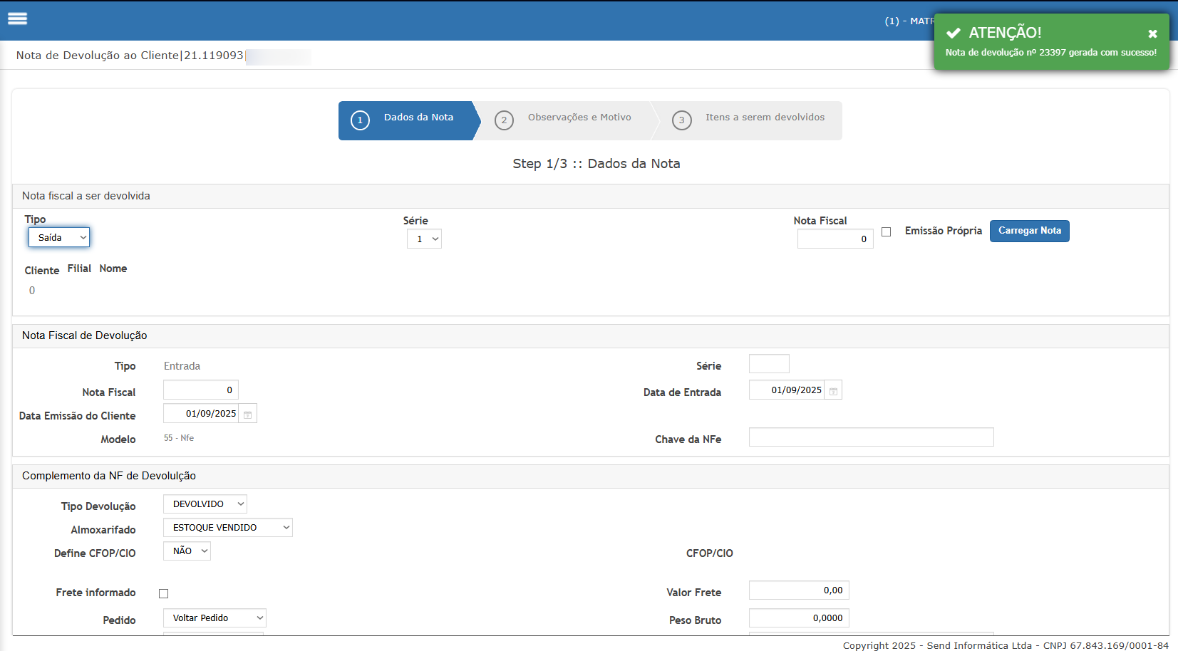Nesse cenário iremos gerar uma nota de devolução, cancelar uma nota fiscal de devolução e validar que os itens do pedido não foram cancelados.