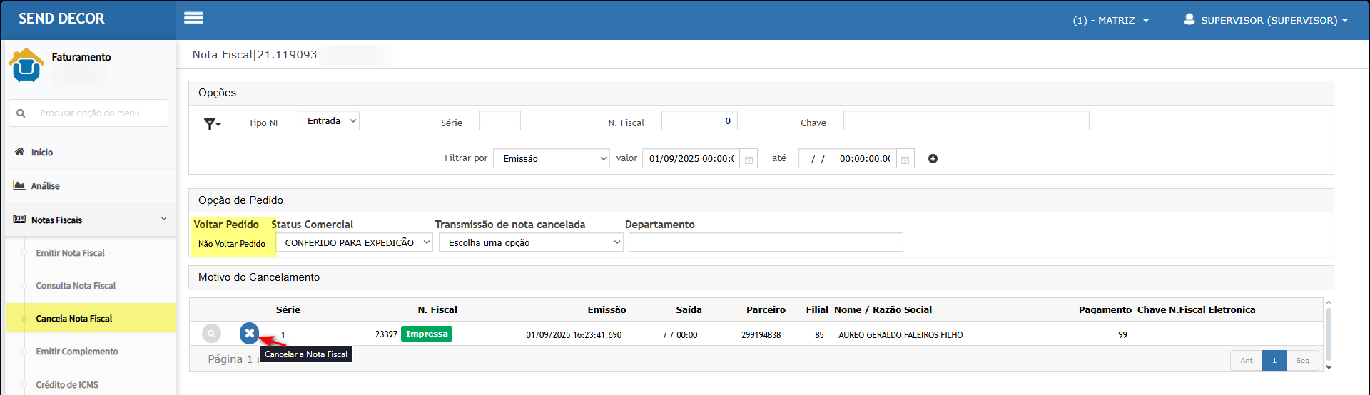 Cancelamento da nota de devolução (para exibir a nota necessário realizar a baixa por contingência no módulo recebimento);