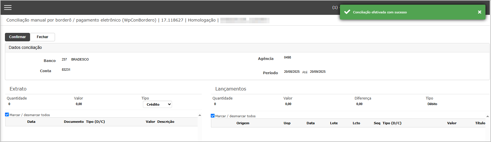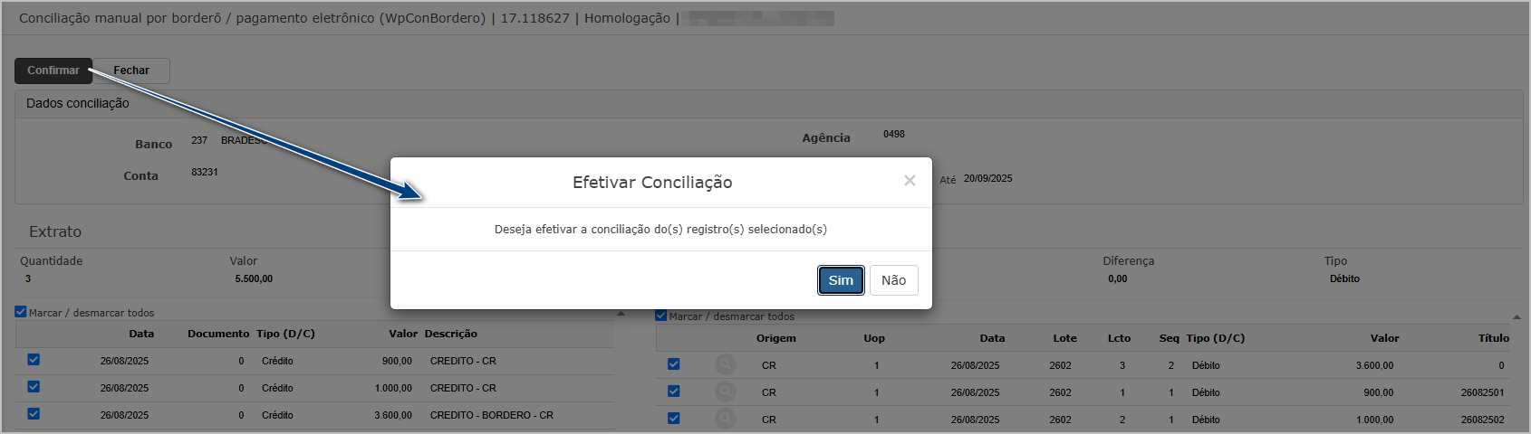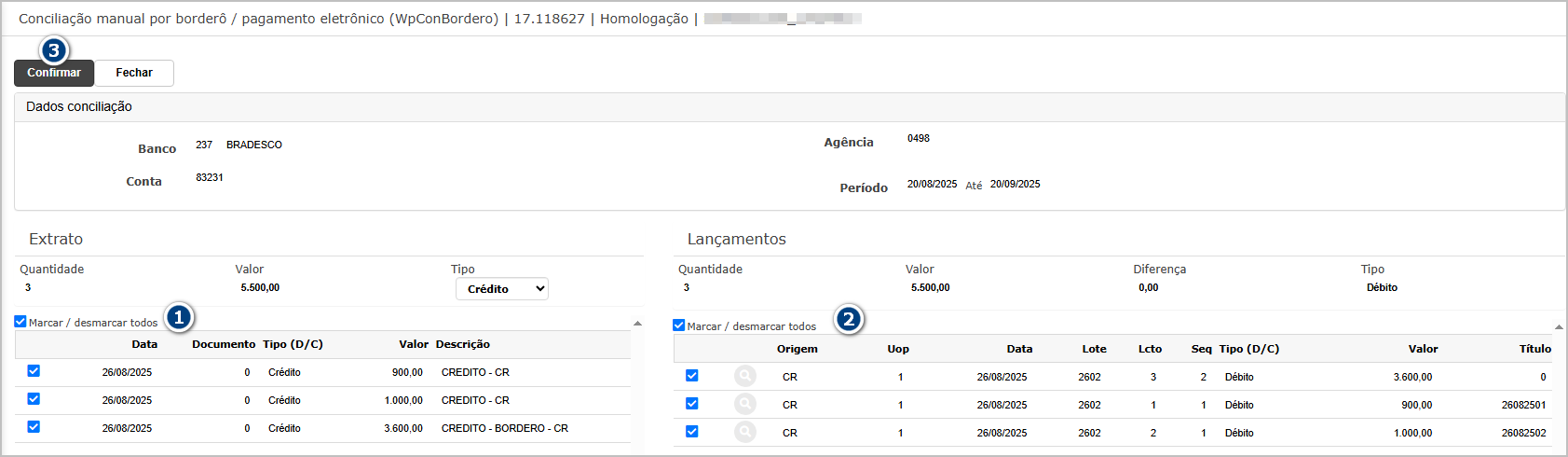 Ao abrir a tela de conciliação, note que os lançamentos são exibidos. Para efetuar a conciliação, marque o item do extrato (1) e o lançamento (2), após clique em Confirmar (3).