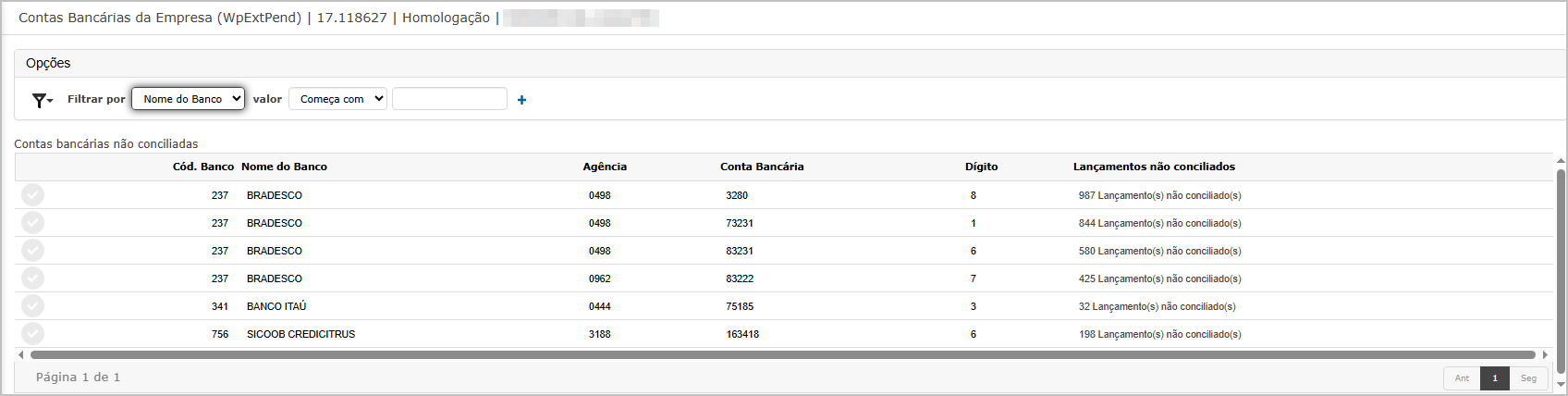 Na tela de conciliação, selecione  o banco/conta que deseja fazer a conciliação.