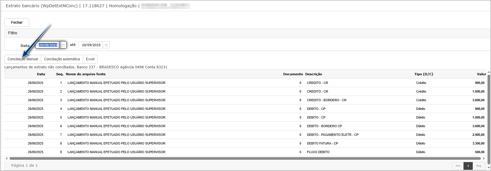 Ao exibir o extrato, informe a data e após clique em Conciliação Manual