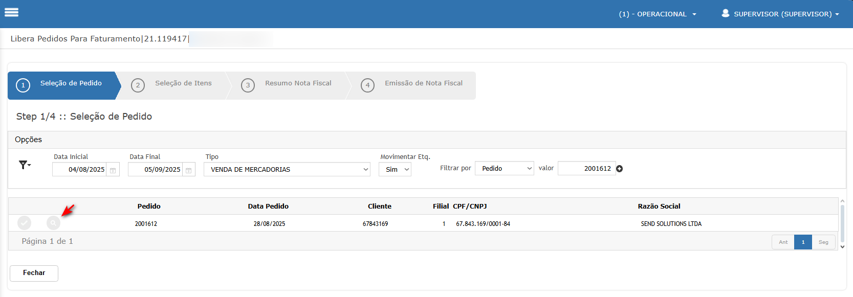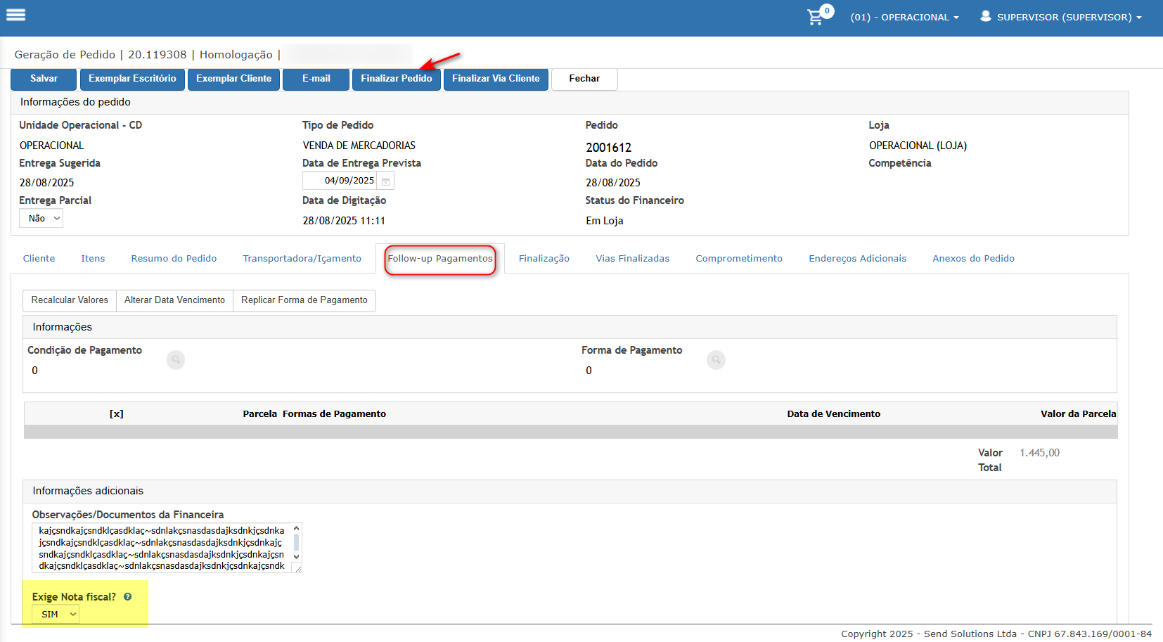 Neste cenário iremos editar um pedido no follow-up de pagamentos e la estará a opção informativa para refletir no faturamento.
