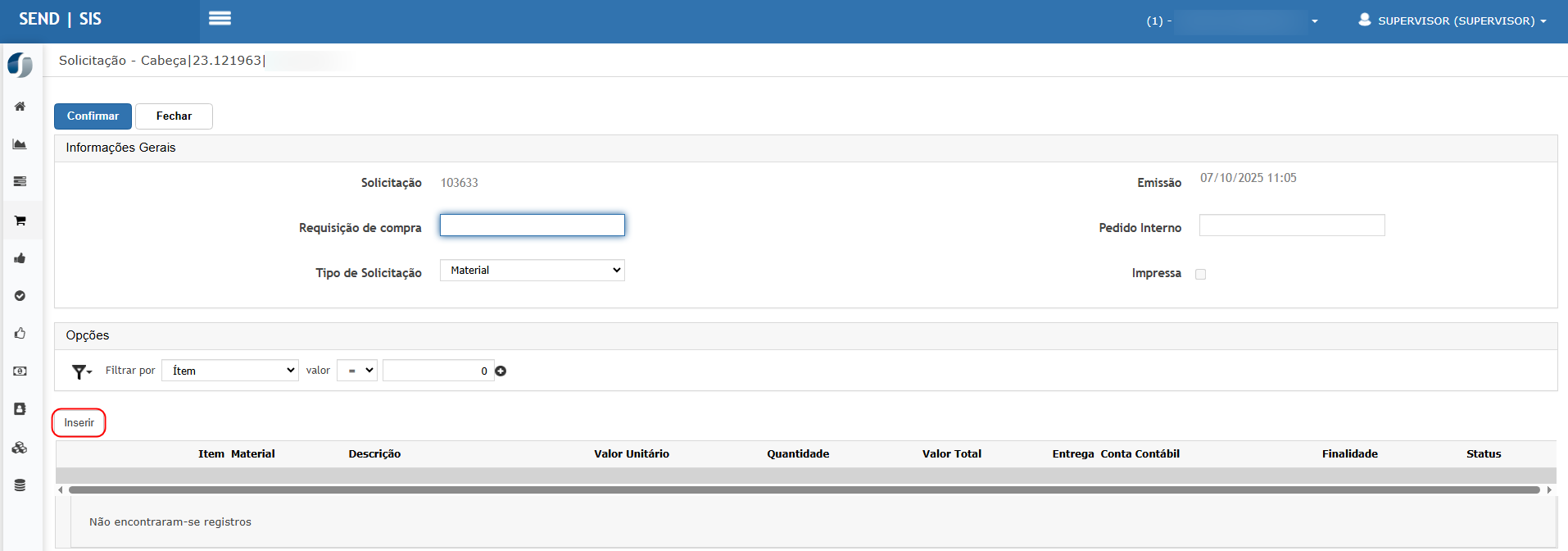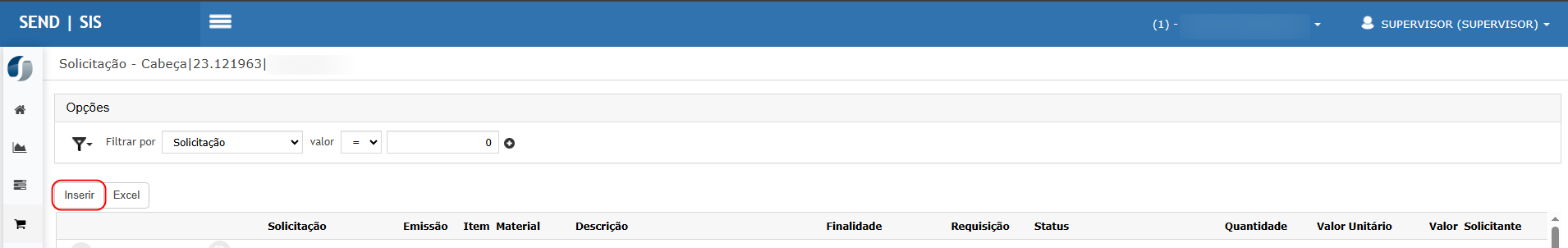Clicar em Inserir para criar uma nova solicitação.