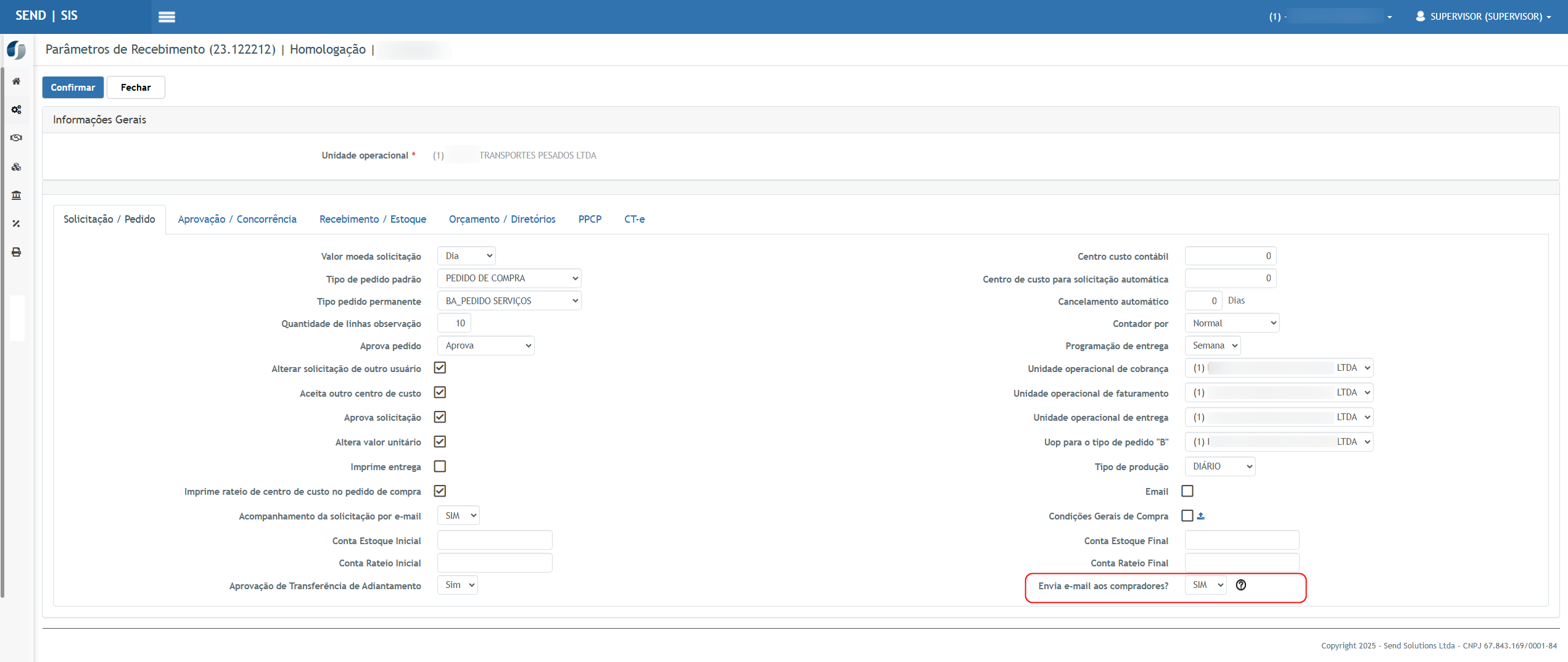 Foi adicionado um parâmetro no cadastro de Parâmetros do Recebimento, indicando se haverá o envio de e-mails aos compradores.