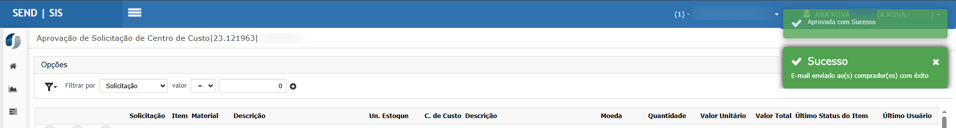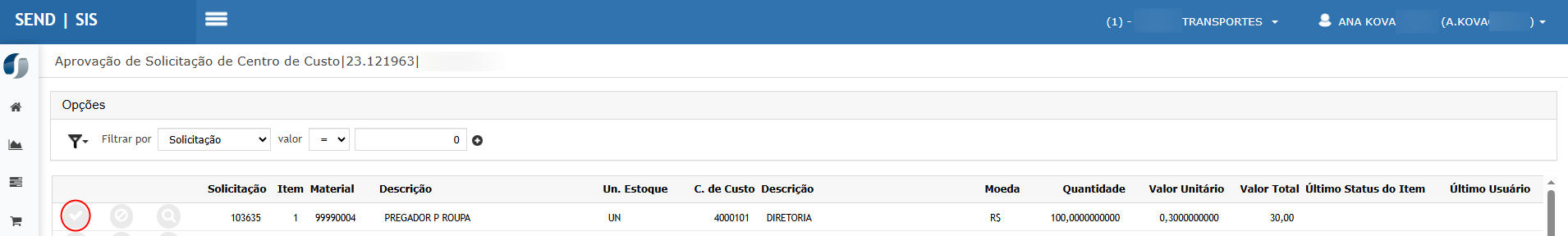 Trocar para o usuário Aprovador, acessar Aprovador > Solicitação de Centro de Custo e clicar em Aprovar.