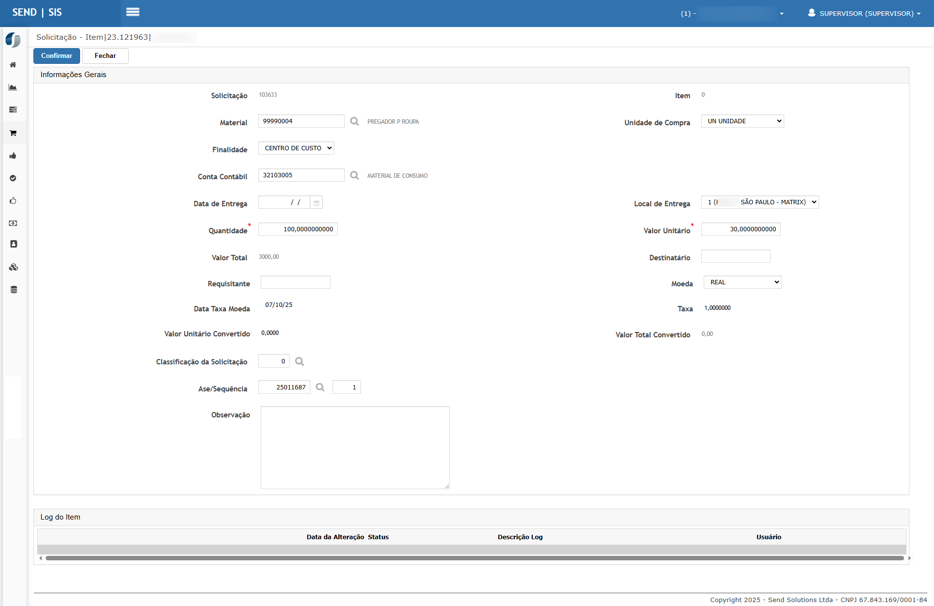 Inserir o item desejado (exemplo: material 99990004) com quantidade 100 e valor unitário 0,30.