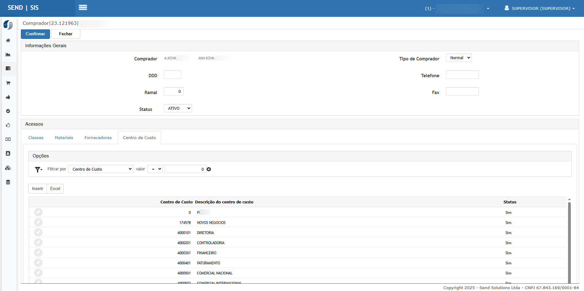 Acessar Cadastros > Compradores > guia Centro de Custo.