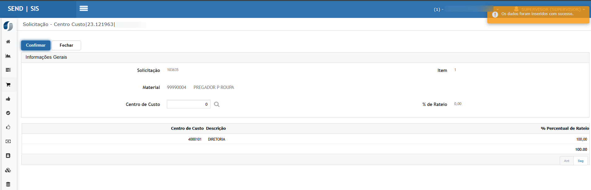 Caso o Centro de Custo da solicitação não possua comprador ativo (Status = Sim), o sistema exibirá um alerta informando a ausência de comprador ativo.