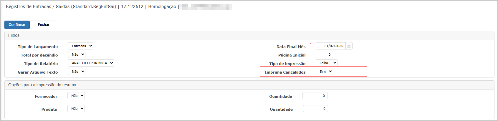 Insira os filtros e clique Confirmar. Note que foi adicionado o novo filtro para Imprime cancelados.