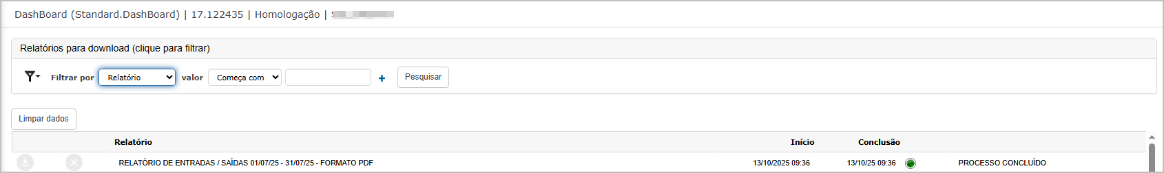 O sistema irá direcionar para o Dashboard e permitirá baixar relatório gerado.