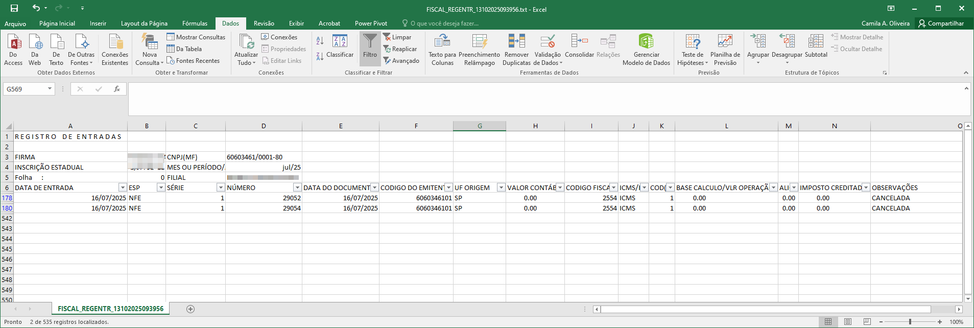 Objetivo: Confirmar a nova regra exibindo entrada própria cancelada.